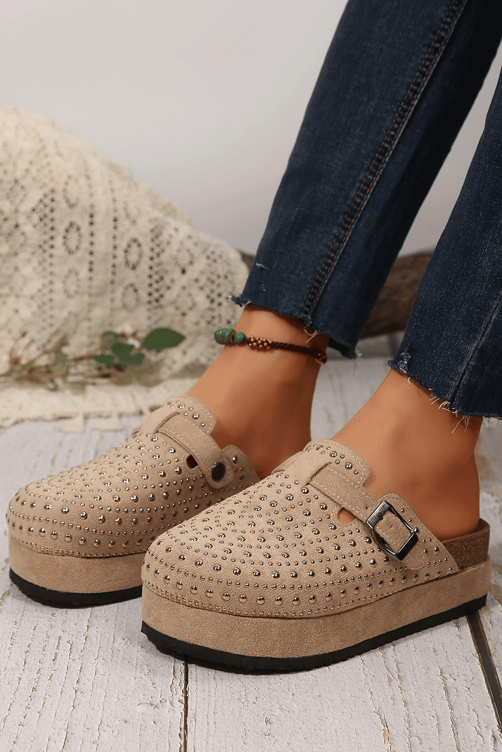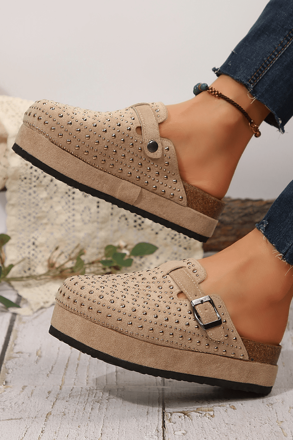 - Elevate your style with rivet and buckle embellished slippers.