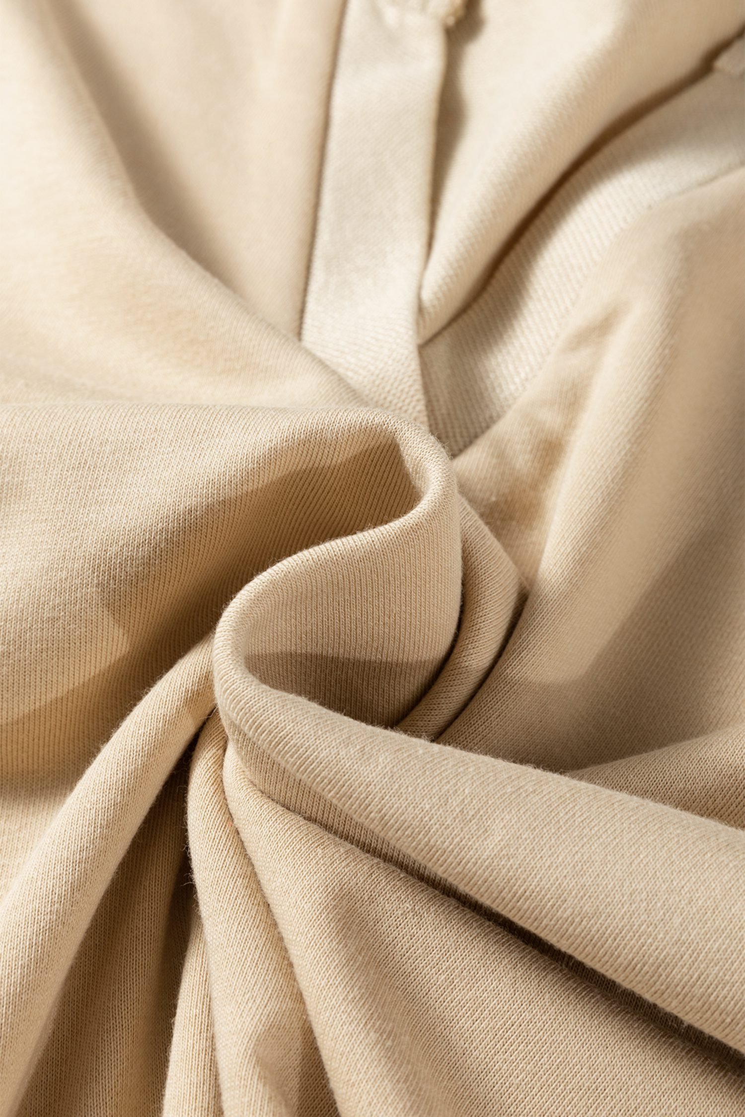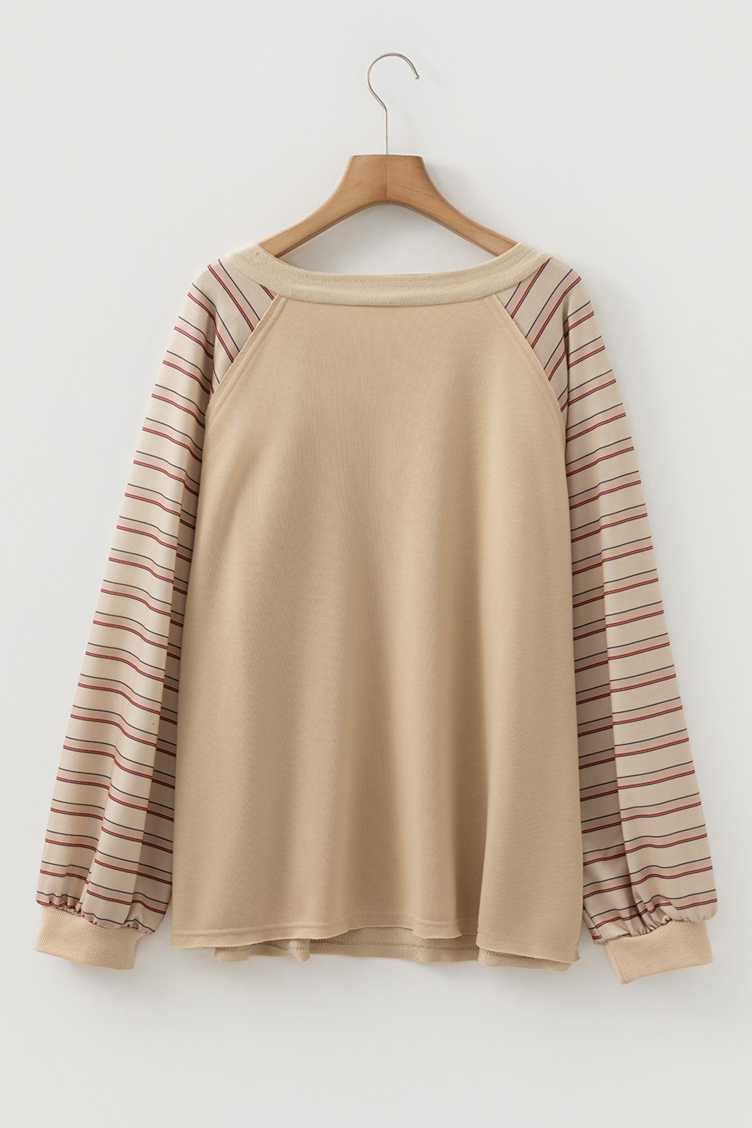 Featuring a notched neck and contrast striped raglan long sleeves.