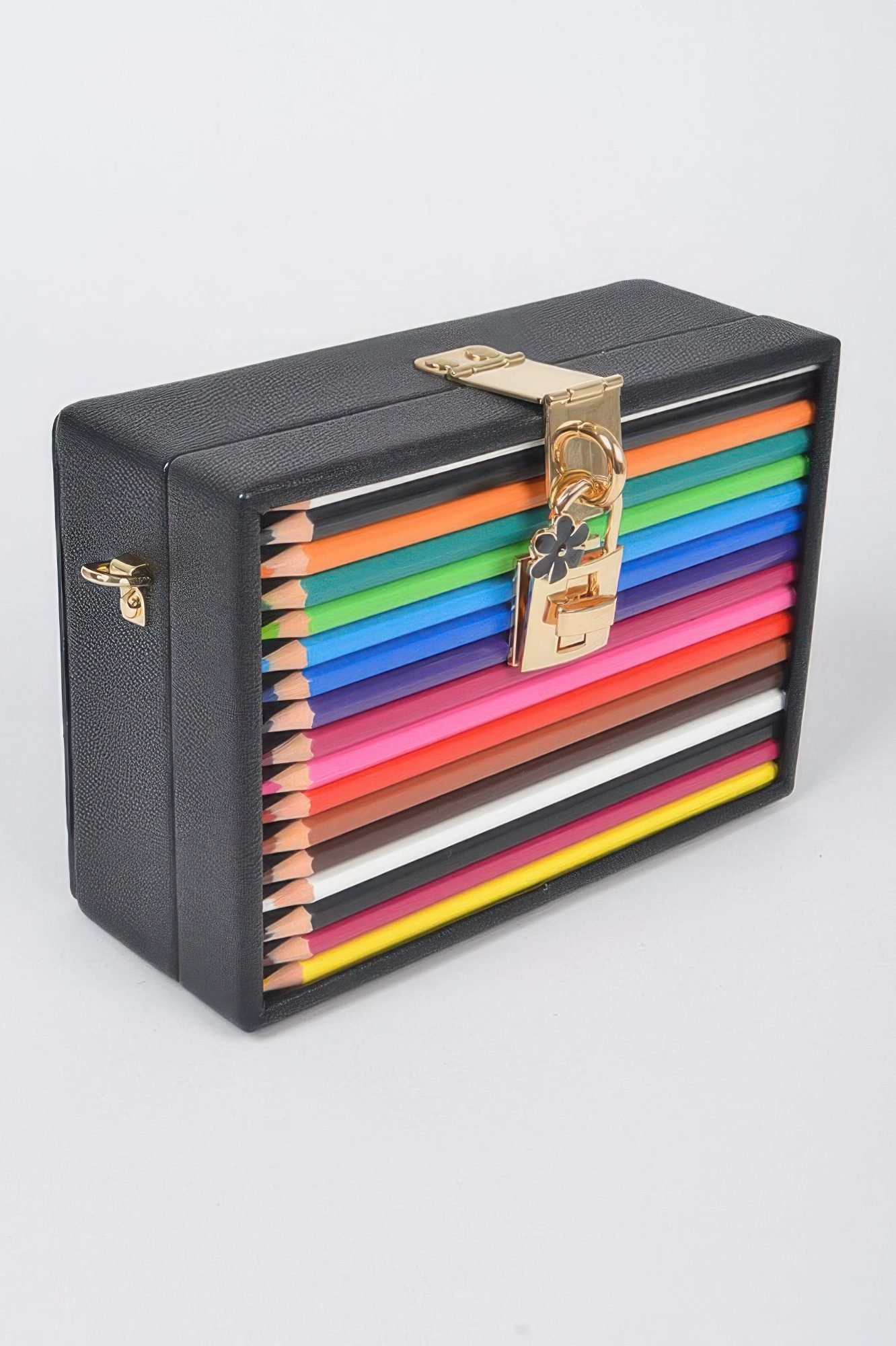 The Pencil Case With Key And Lock Clutch is a sleek and versatile piece that blends utility with refined design. Featuring a structured silhouette and a secure lock-and-key closure, this accessory keeps essentials stylishly in place. Made from smooth polyurethane with a chain detail, it doubles as a mini clutch for on-the-go moments. Whether used for stationery or small daily items, it adds a polished edge to your organization.