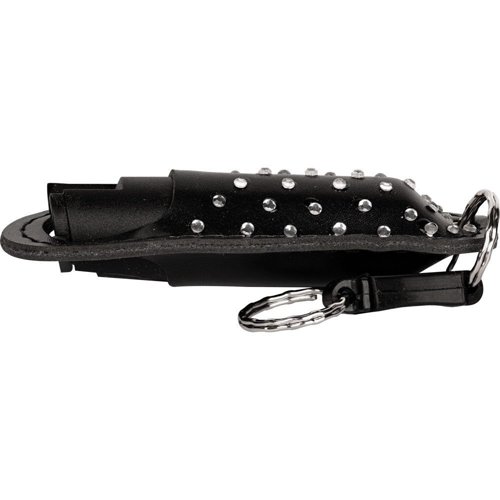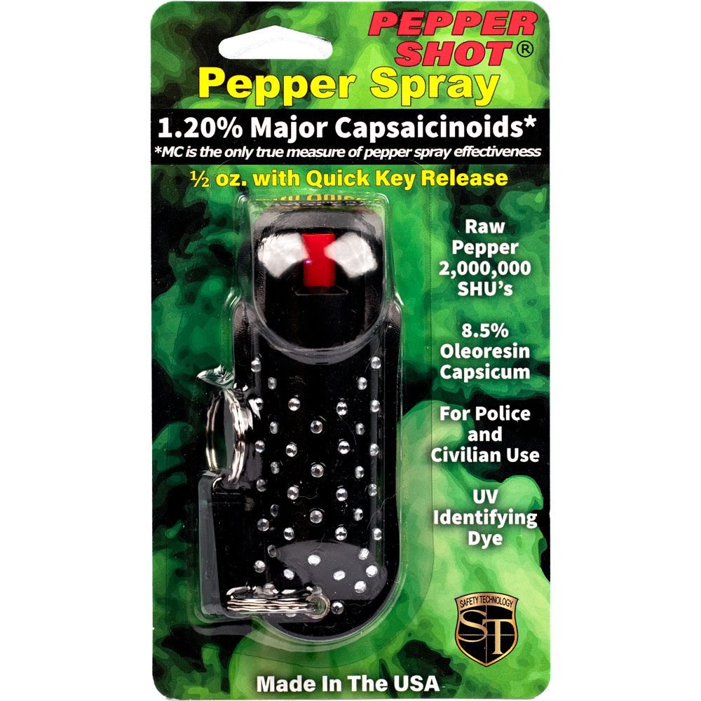 Pepper Shot 1.2% MC 1/2 oz Halo Rhinestone leatherette holster black. Pepper Shot Pepper Spray is made with 1.2% Major Capsaicinoids. The Major Capsaicinoids are the true heat measure and Pepper Shot 1.2% MC is more effective than of most other pepper sprays. In addition to causing an attacker pain, The Pepper Shot 8.5% oleoresin capsicum formula swells the mucous membranes, which makes breathing difficult, and swells the veins in the eyes, causing the eyes to close. It’s made from 2,000,000 SHU’s of raw pepper and these effects can last up to 45 minutes and cause no permanent damage. Has a UV identifying dye to help aid in the identification of an attacker. 1/2 oz with halo rhinestone leatherette holster, locking actuator and quick key release keychain. Effective up to 6-8 feet. Contains 6-10 one second bursts. 4 ?” x 1 ?”