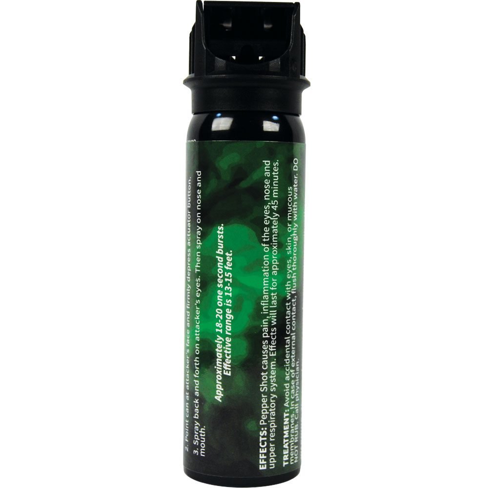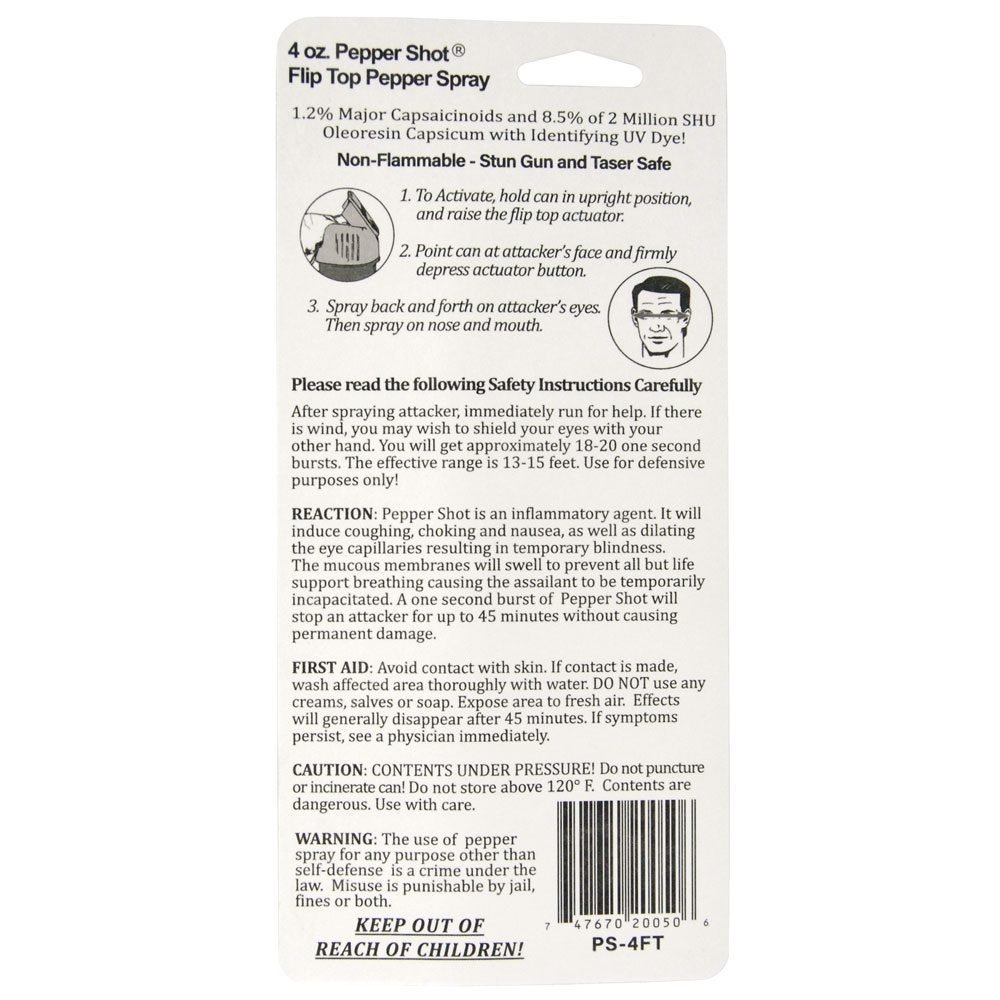 Pepper Shot 4 oz 1.2% MC pepper spray flip top model. Pepper Shot Pepper Spray is made with 1.2% Major Capsaicinoids. The Major Capsaicinoids are the true heat measure and Pepper Shot 1.2% MC is more effective than of most other pepper sprays. In addition to causing an attacker pain, The Pepper Shot 8.5% oleoresin capsicum formula swells the mucous membranes, which makes breathing difficult, and swells the veins in the eyes, causing the eyes to close. It’s made from 2,000,000 SHU’s of raw pepper and these effects can last up to 45 minutes and cause no permanent damage. Has a UV identifying dye to help aid in the identification of an attacker. It has a flip top actuator stream 18-20 one second burst & range of 13-15 feet. 5 ?” x 1 ?”