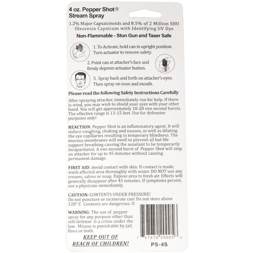 Pepper Shot 1.2% MC 4 oz pepper spray stream. Pepper Shot Pepper Spray is made with 1.2% Major Capsaicinoids. The Major Capsaicinoids are the true heat measure and Pepper Shot 1.2% MC is more effective than of most other pepper sprays. In addition to causing an attacker pain, The Pepper Shot 8.5% oleoresin capsicum formula swells the mucous membranes, which makes breathing difficult, and swells the veins in the eyes, causing the eyes to close. It’s made from 2,000,000 SHU’s of raw pepper and these effects can last up to 45 minutes and cause no permanent damage. Has a UV identifying dye to help aid in the identification of an attacker. Our 4 ounce Pepper Shot is a favorite with security guards and gives great protection at home. Get the leatherette holster with belt clip to carry on your belt. The stream has a range of 13-15 feet and 18-20 one second shots. 5 ?” x 1 ?”