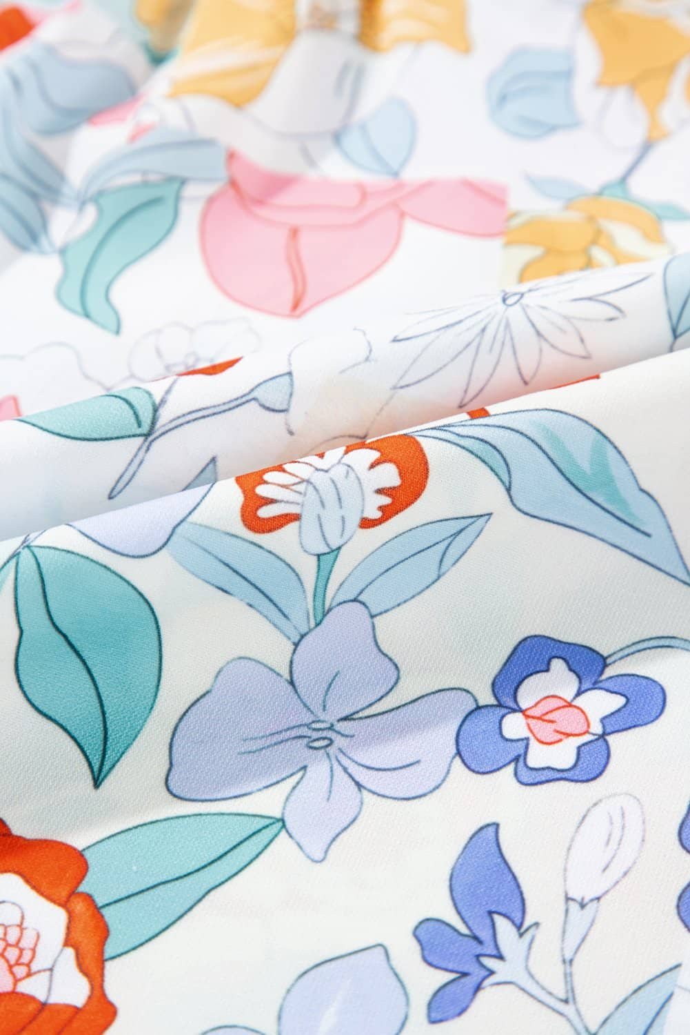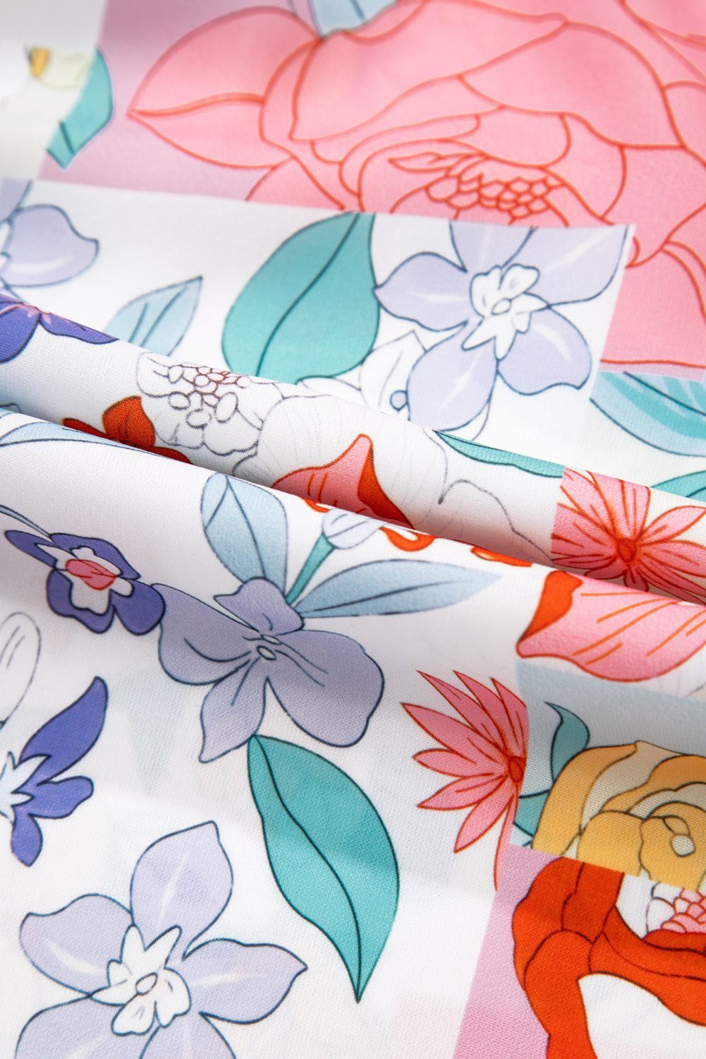 Features a floral print and a striking V neck with guipure details.