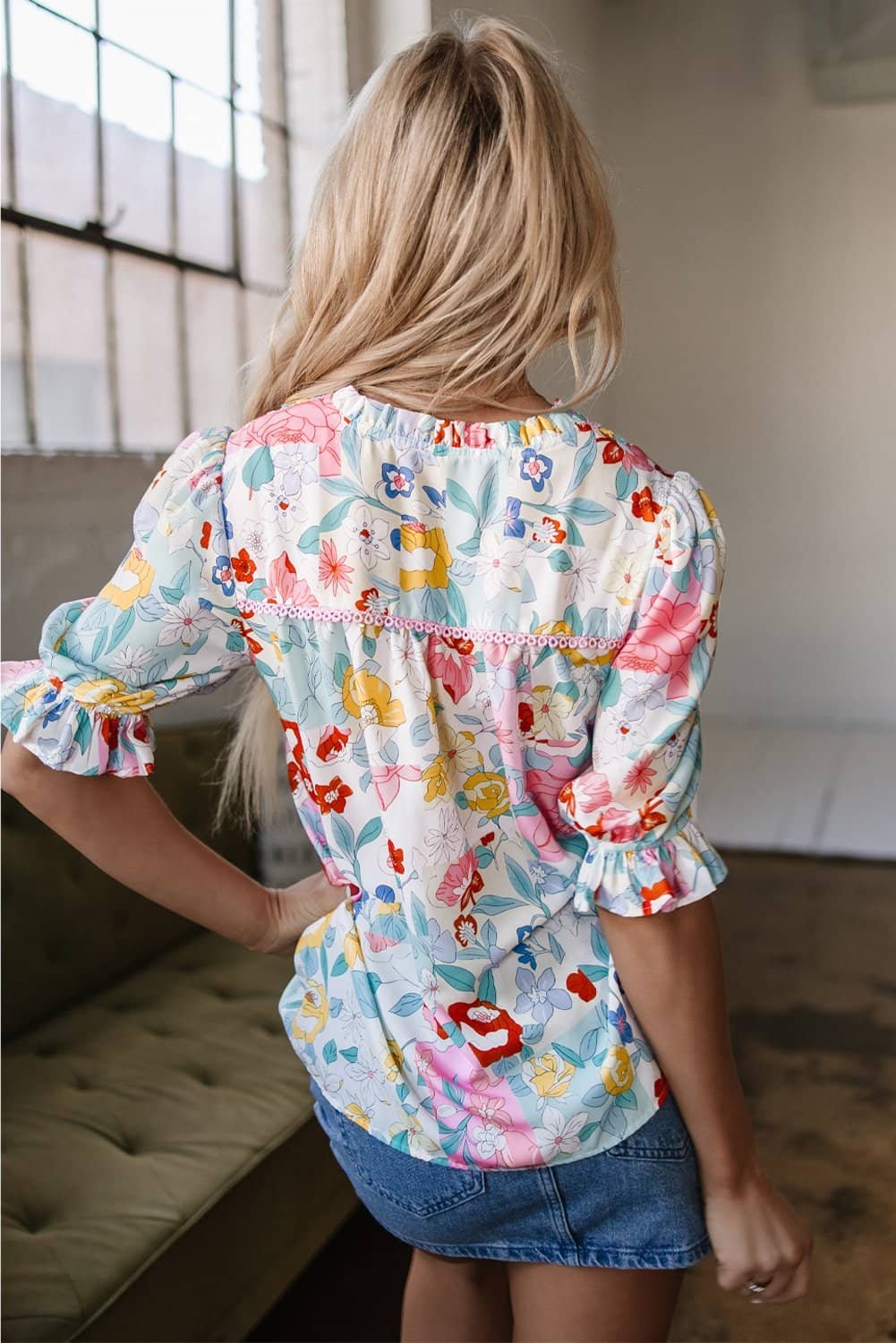 Frilled details at neckline and bubble sleeves for a unique, feminine look.