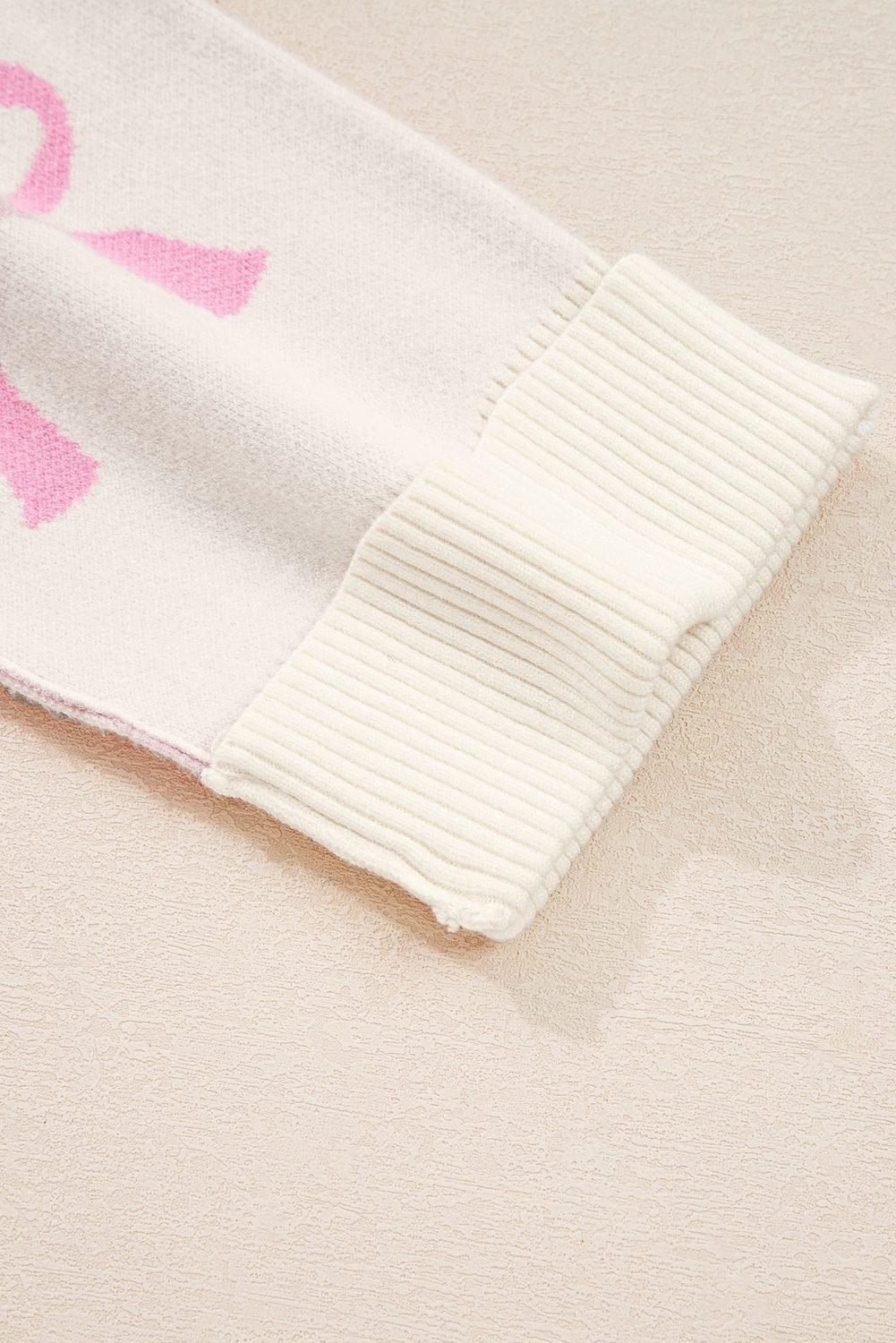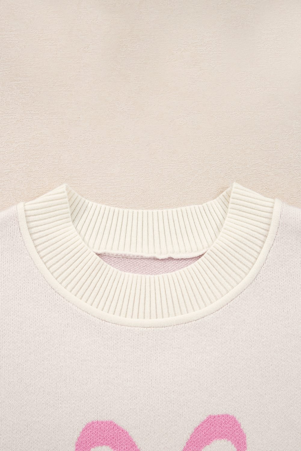 Be the first to review “Pink Bow Print Ribbed Trim Exposed Seam Drop Shoulder Loose Sweater”