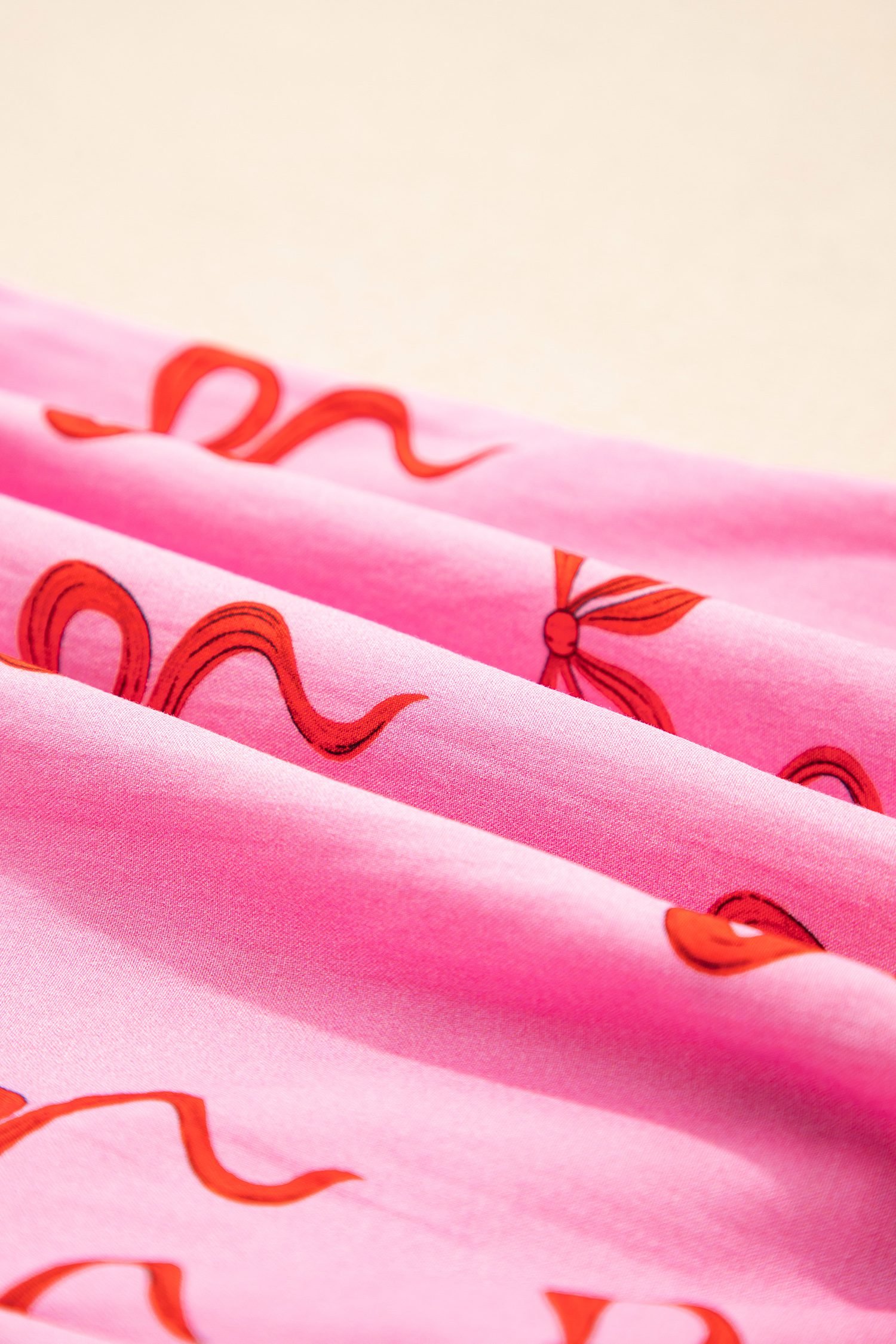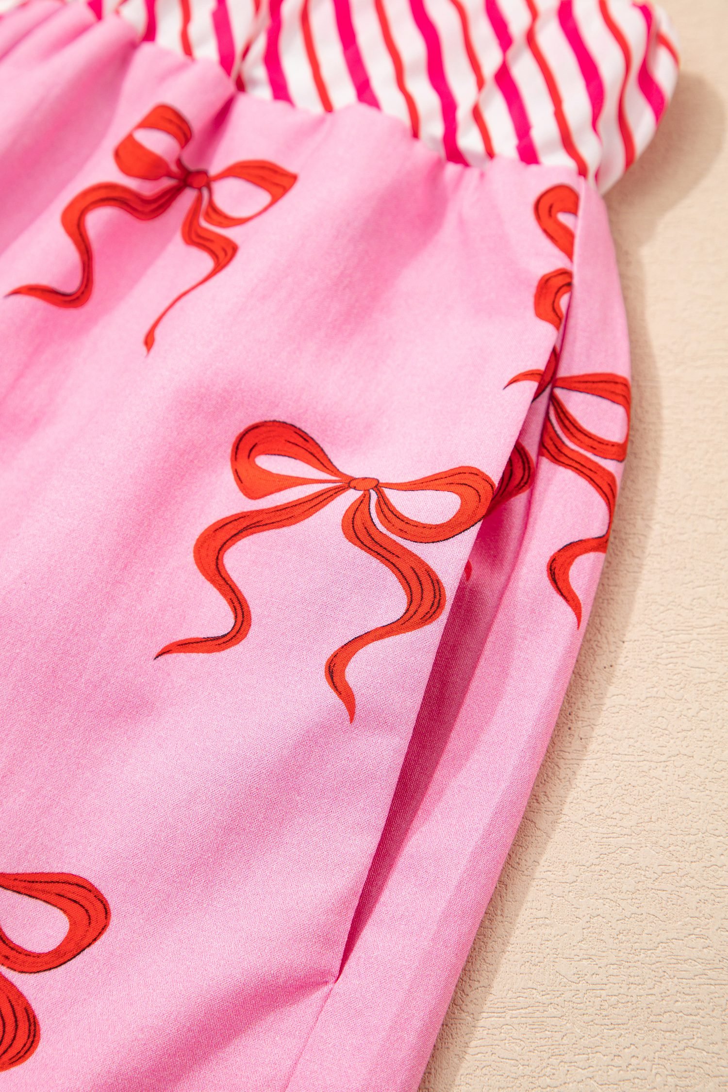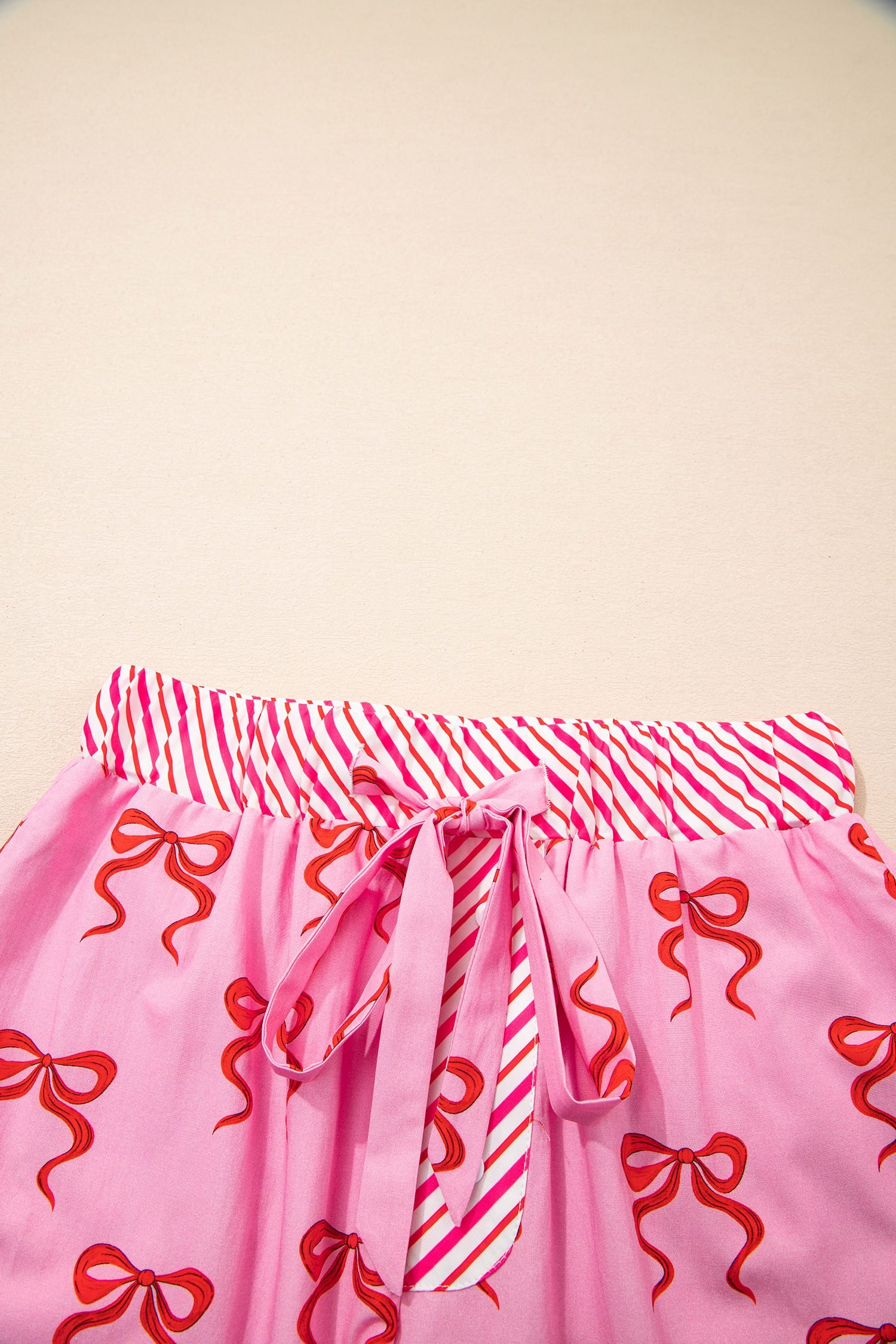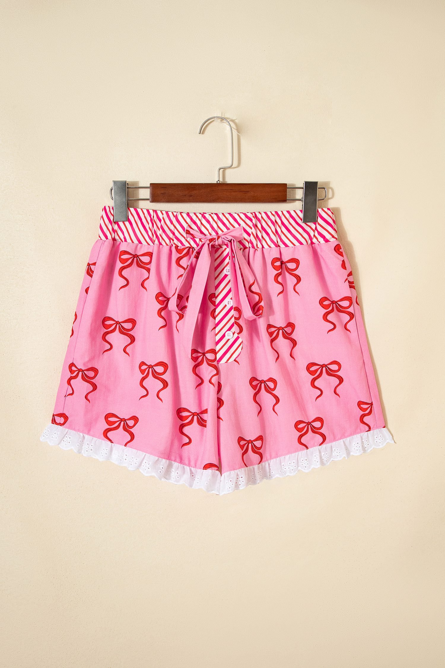 This sweet pink shorts have feminine bow print and lace trim.