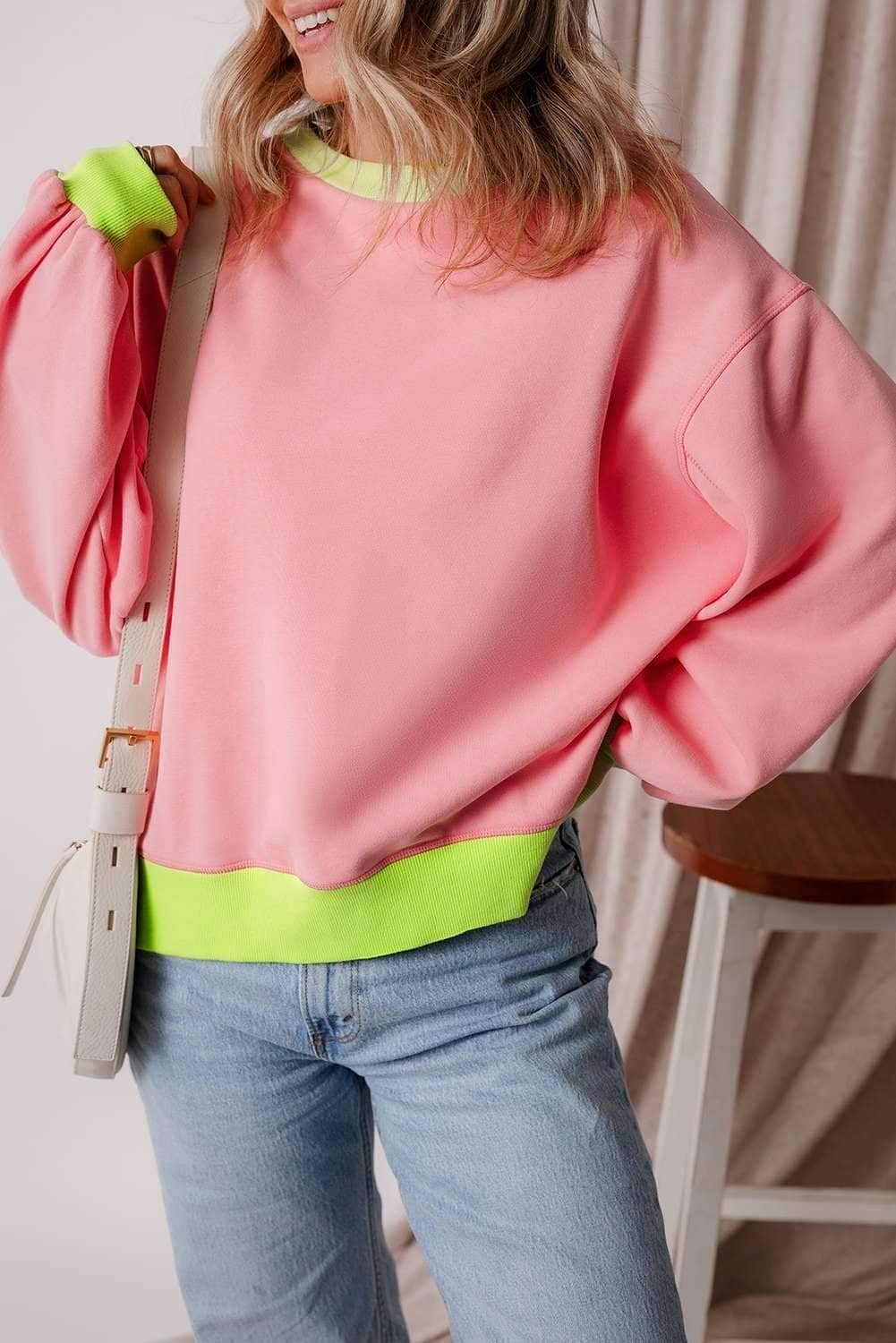 - The contrast trim creates a chic color block design to this pullover