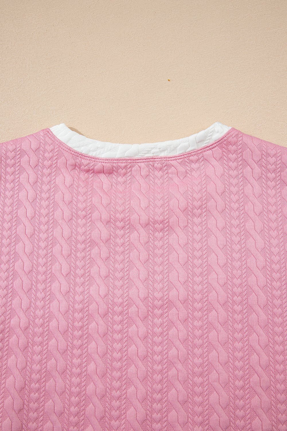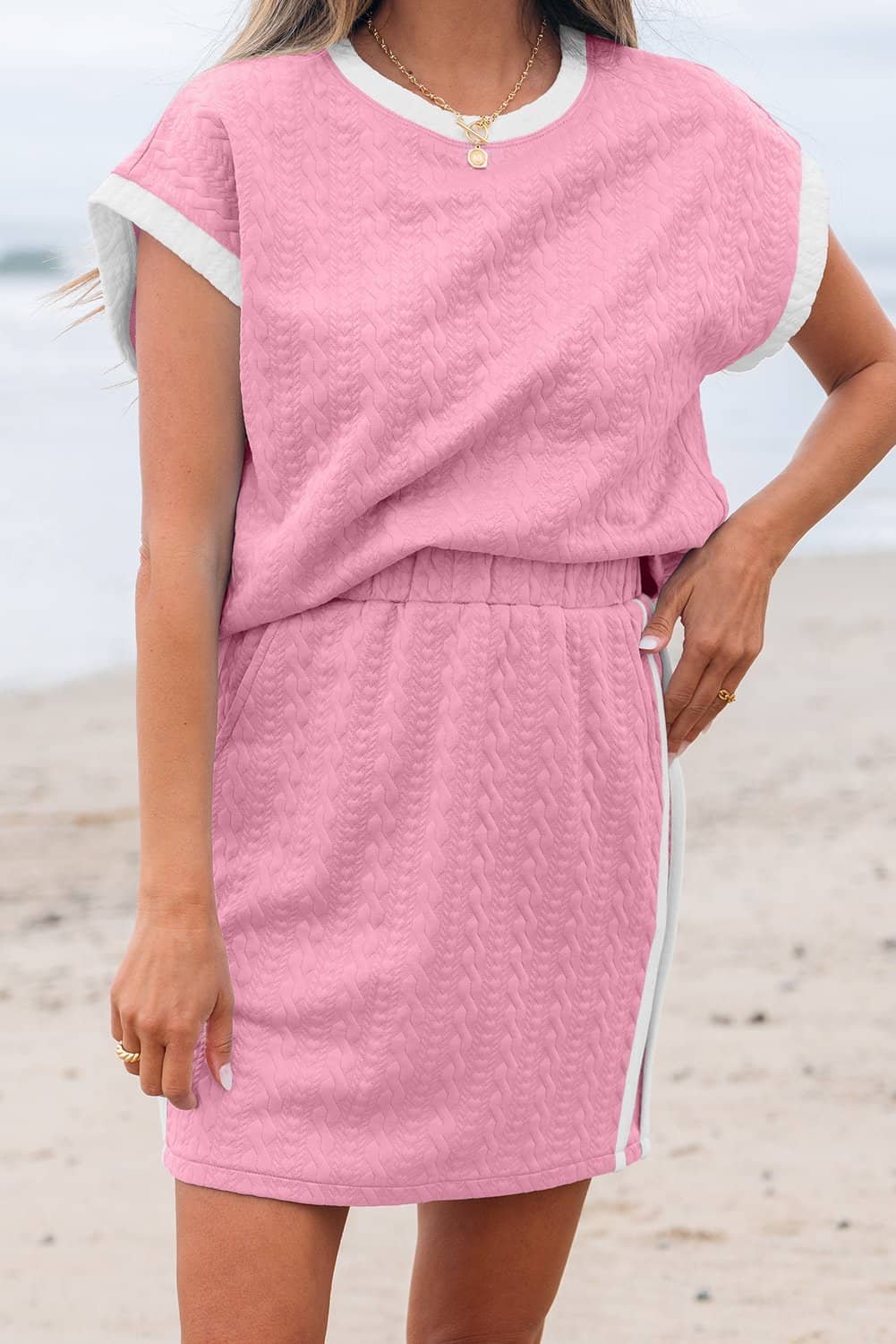 Pink Contrast Trim Textured Crewneck Tee And Pocketed Skirt Set