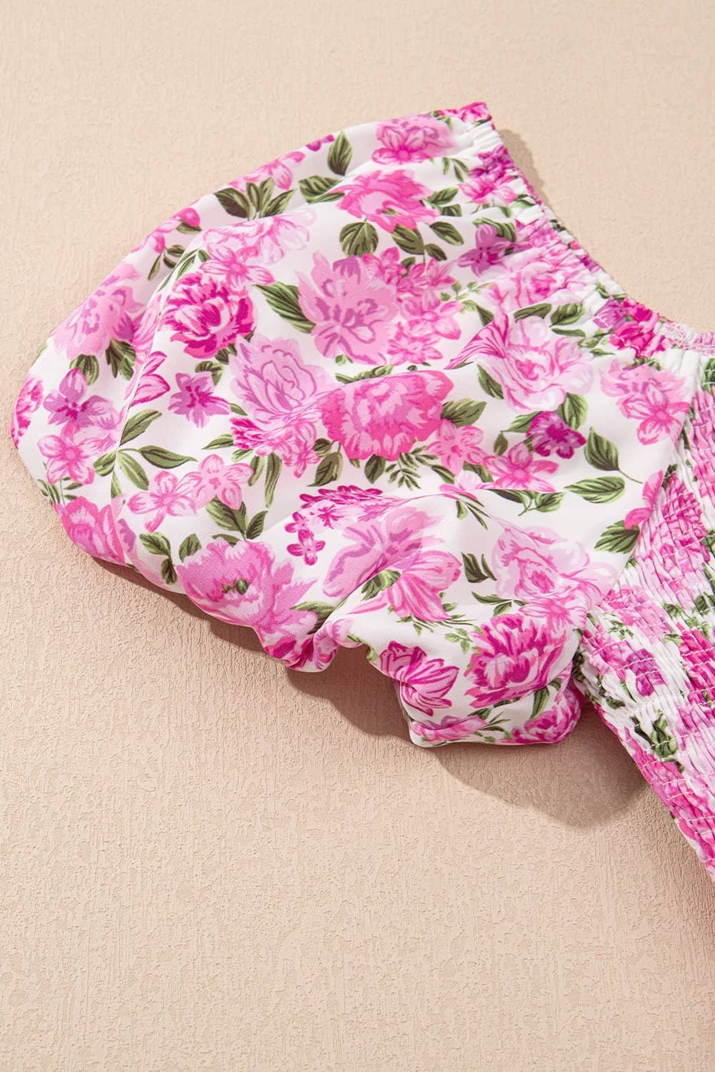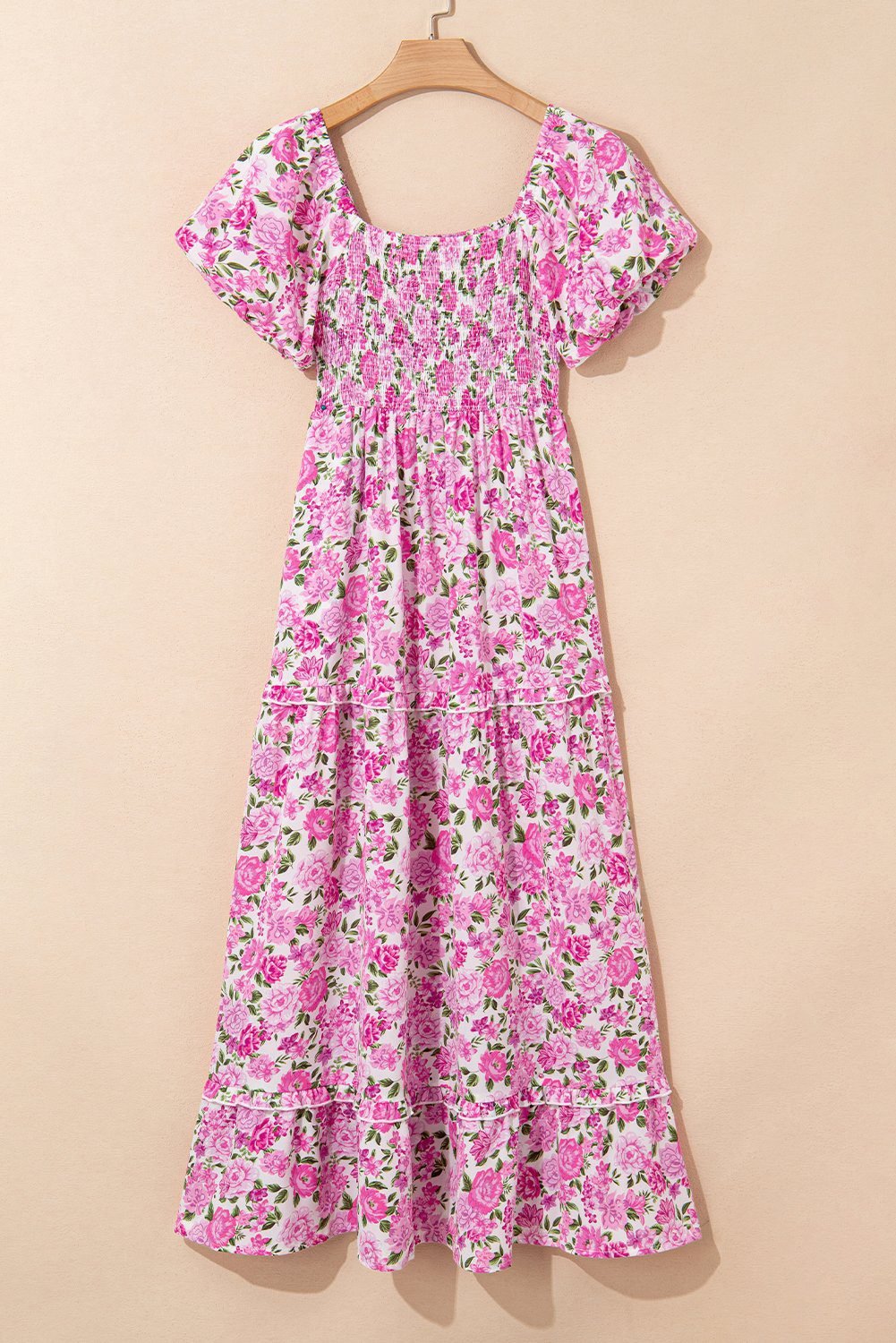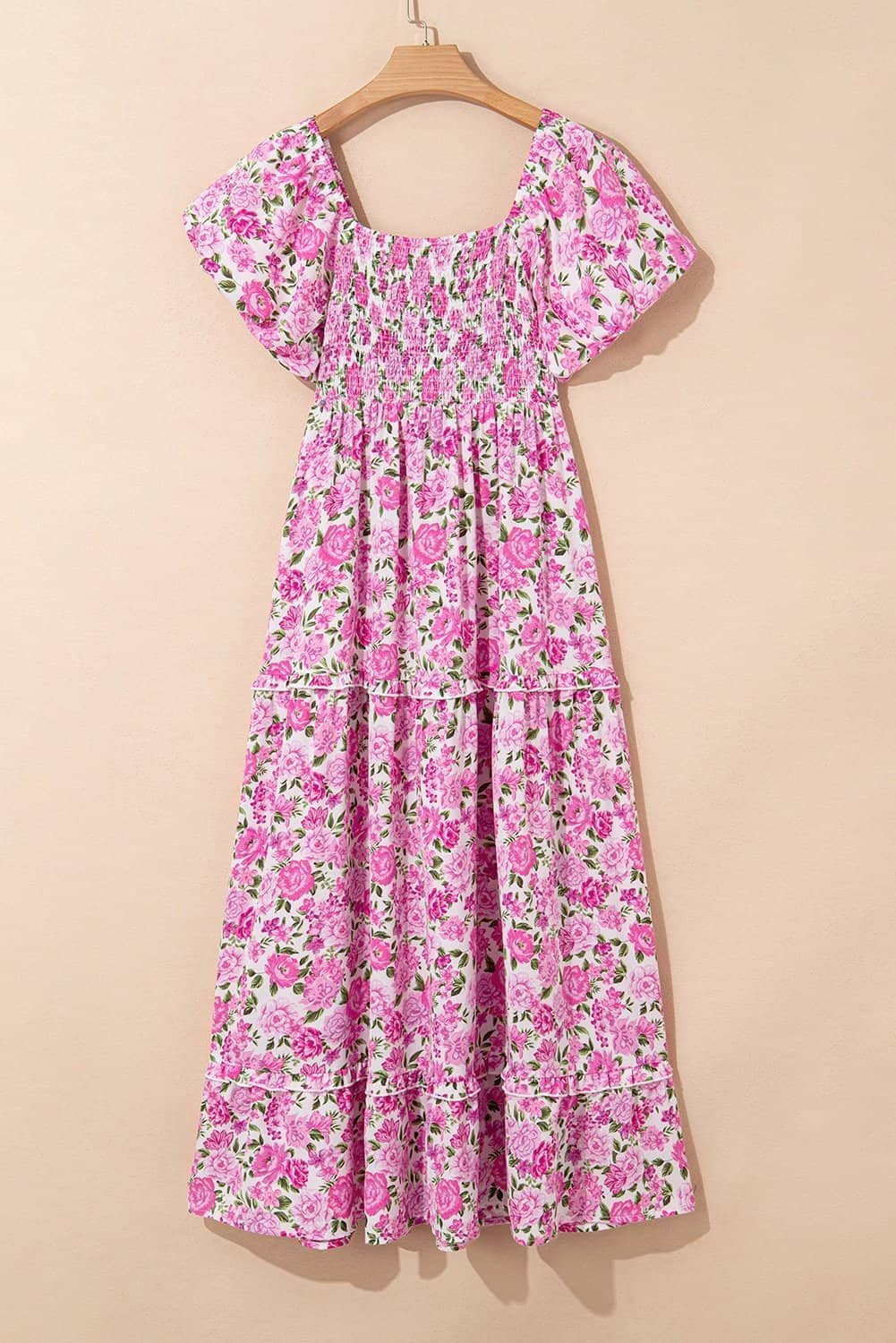 This blooming flower dress features a square neck, puff short sleeve and flowy fit.