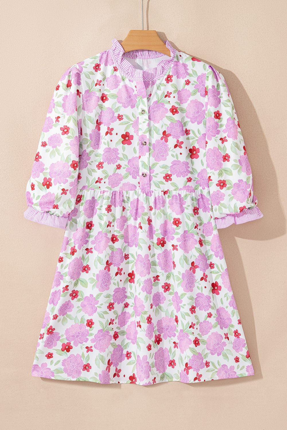 Be the first to review “Pink Floral Print Striped Trim Frilled Neck 3/4 Sleeve Flared Mini Dress”