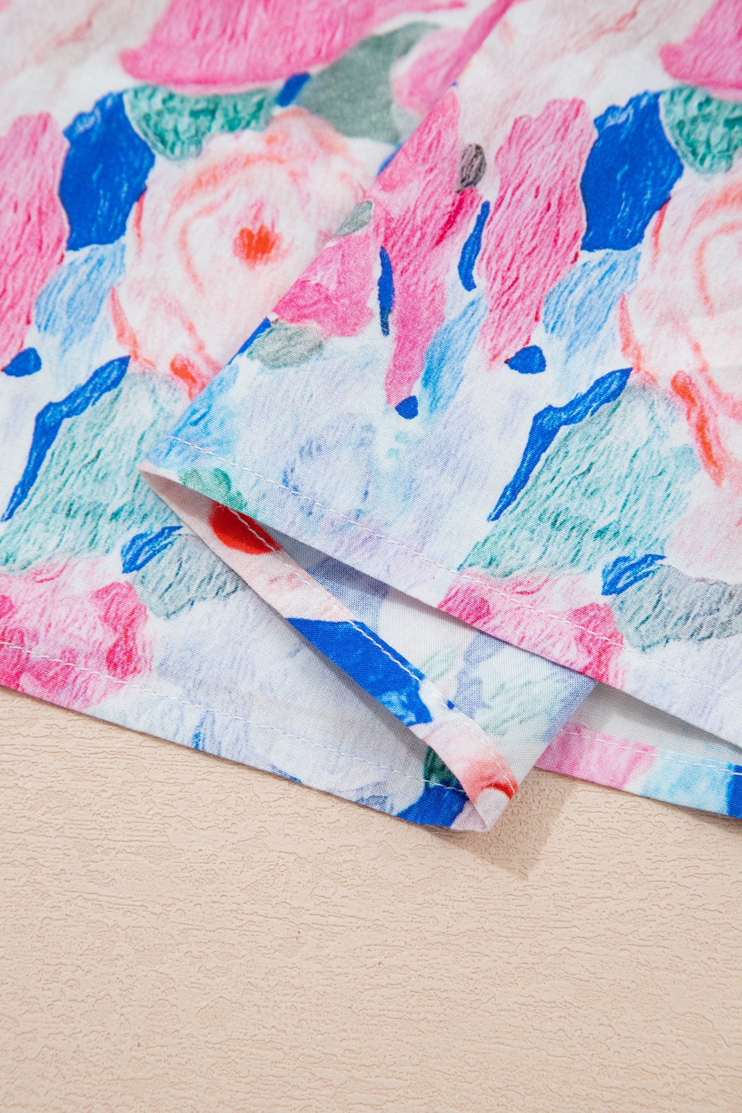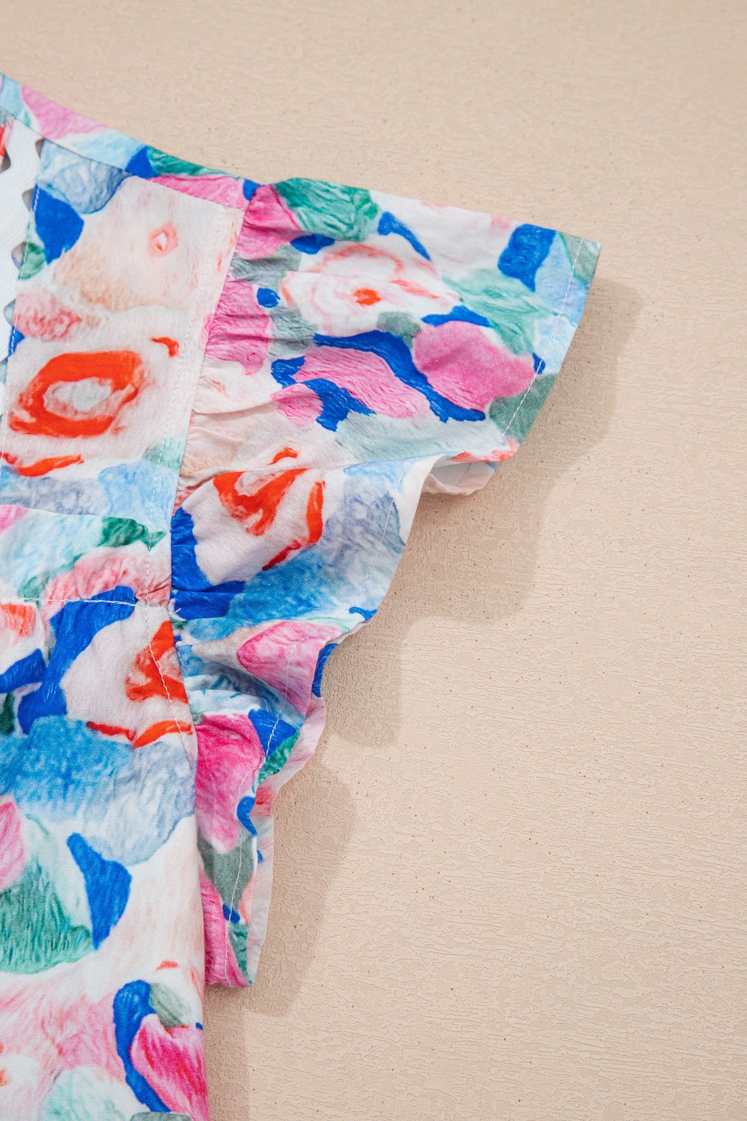 Pink Floral Print Tie V Neck Contrast Detail Ruffle Short Sleeve Blouse