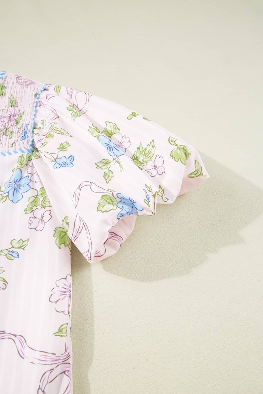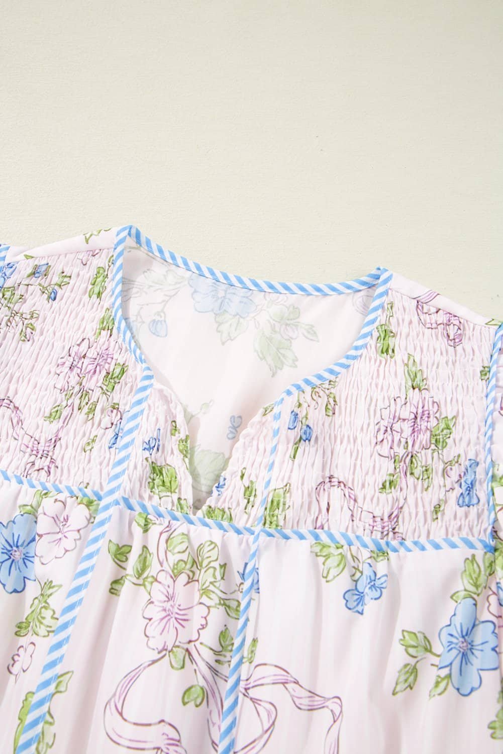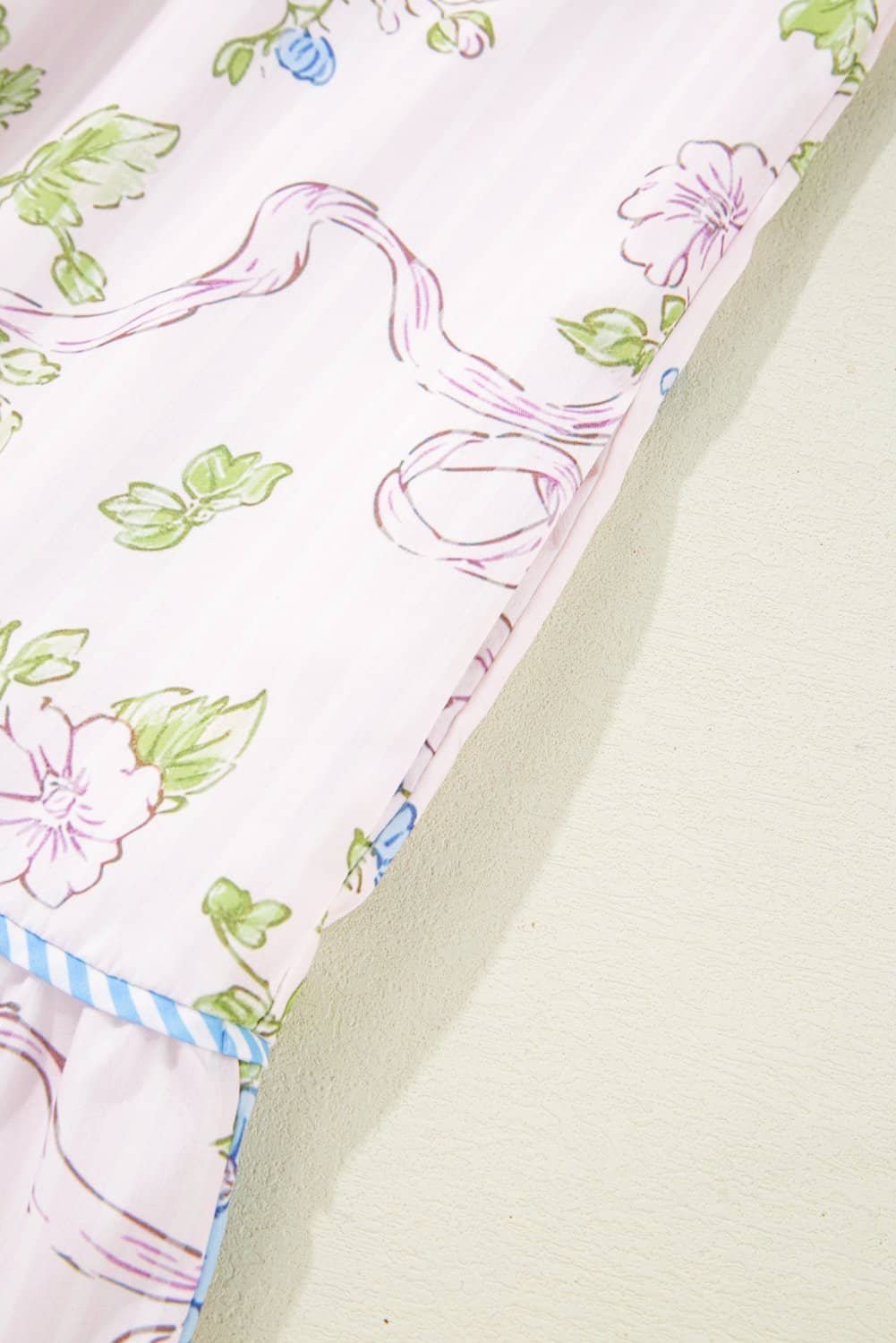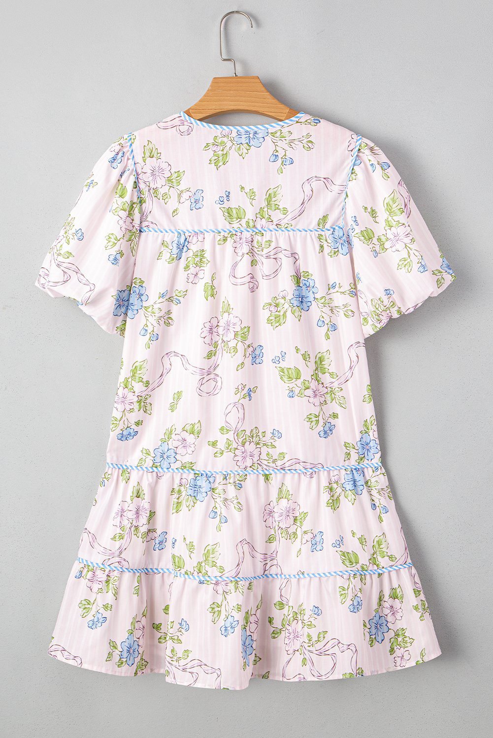 Pink Floral Striped Print Contrast Trim Tie Split Neck Mini Dress
