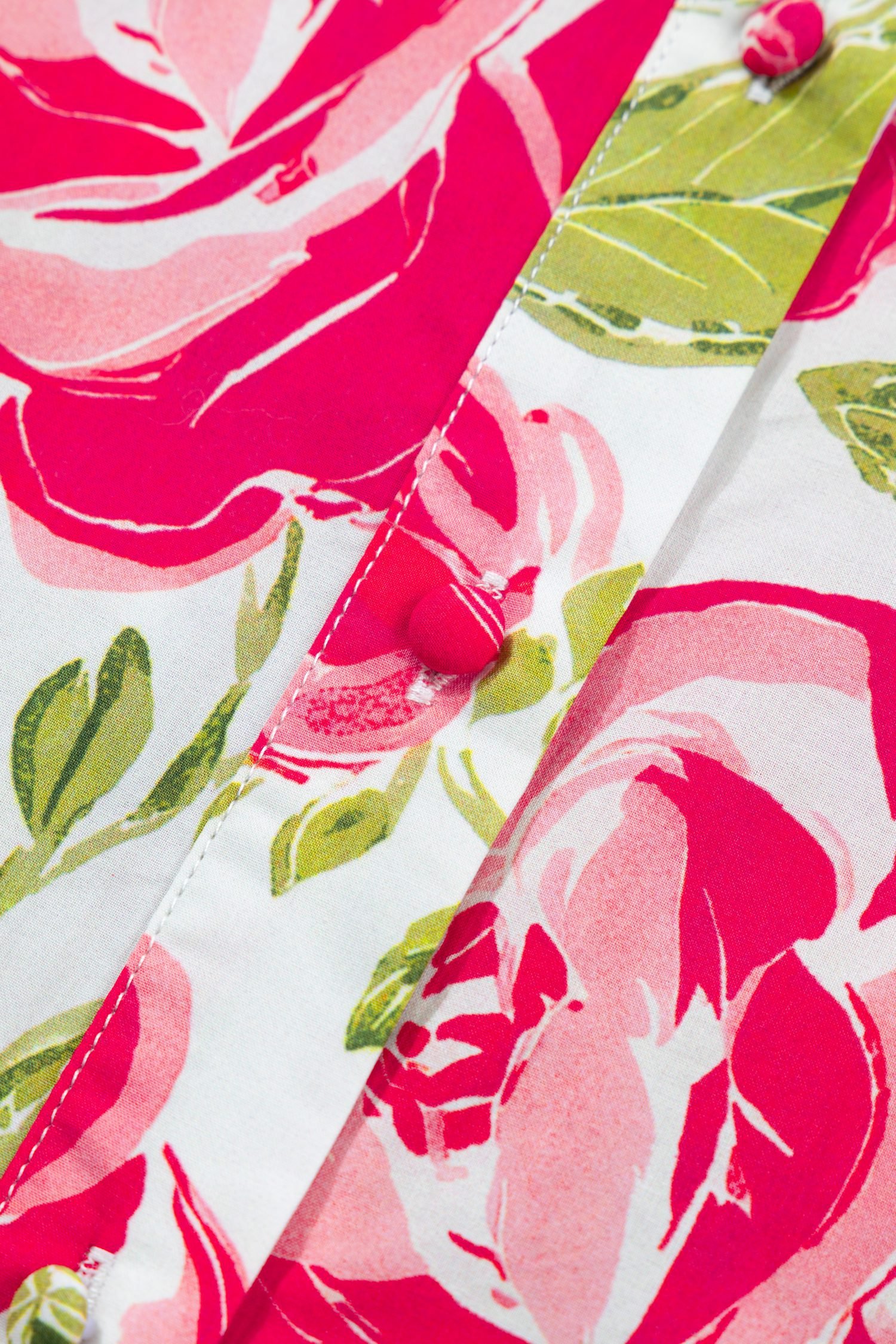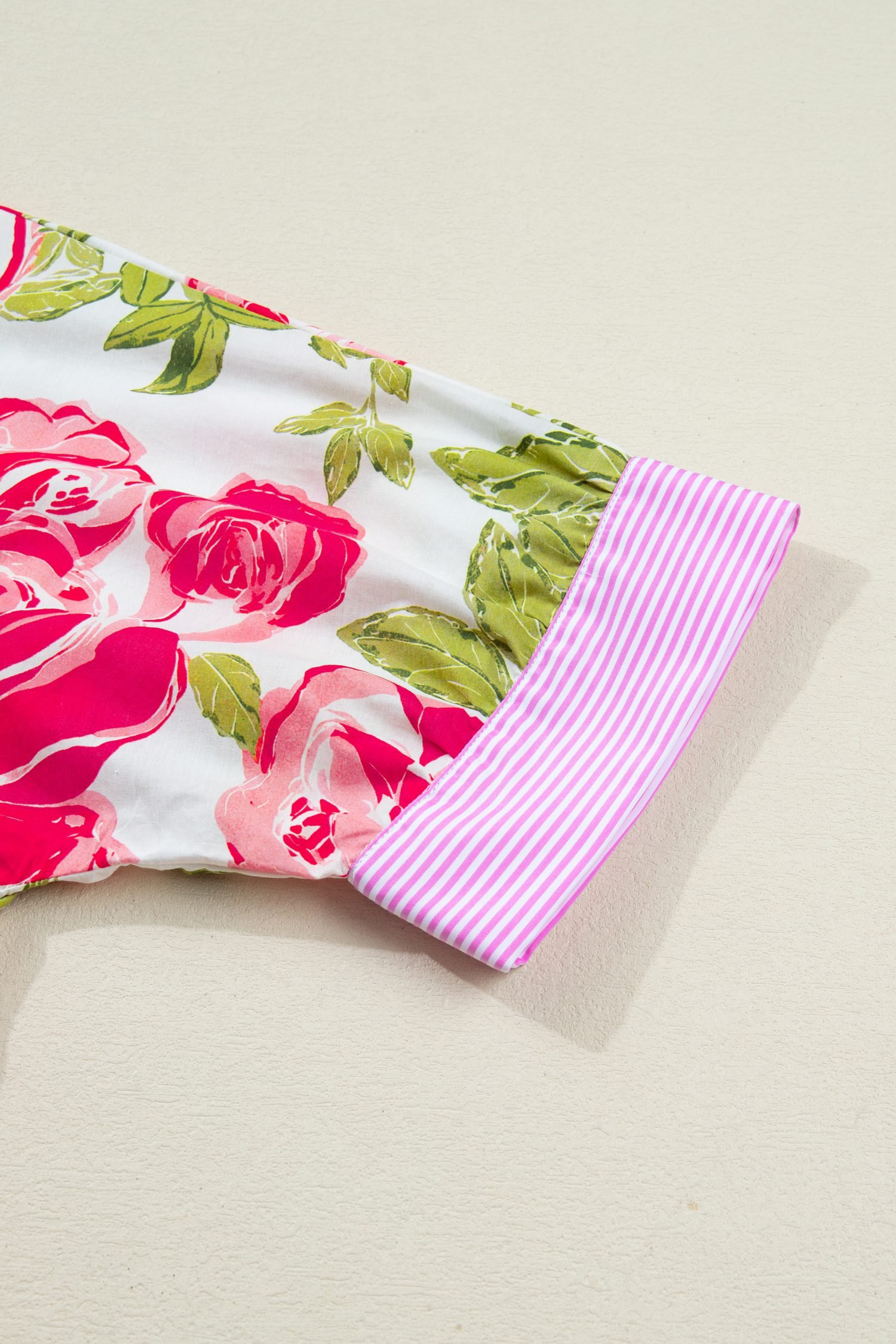 Floral shirt with striped trim brings a fresh, eye-catching contrast.