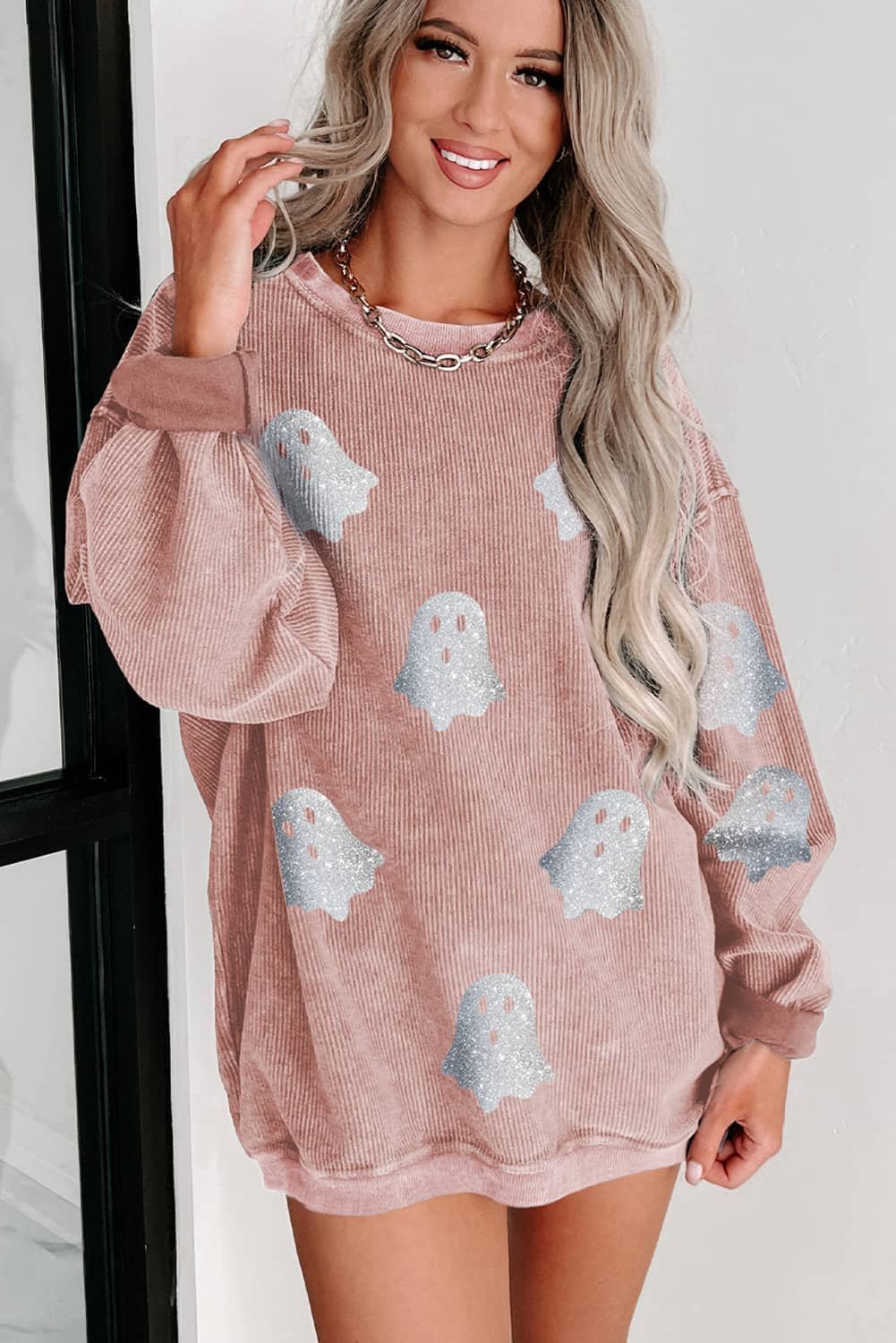 - The sweatshirt is a glamorous choice for the spooky season.