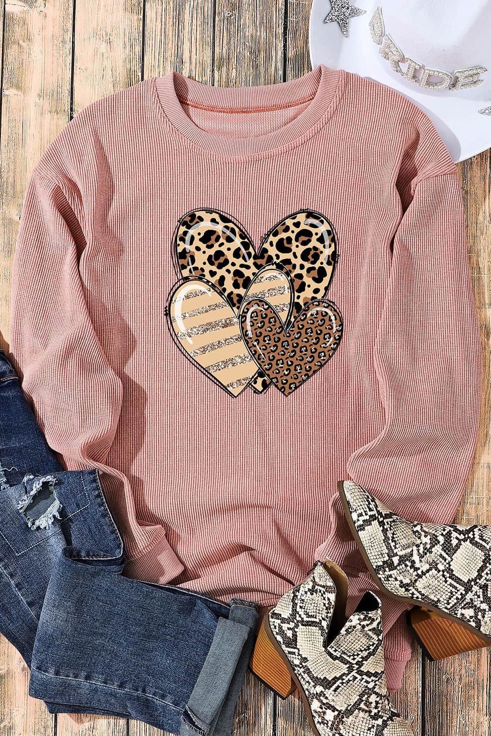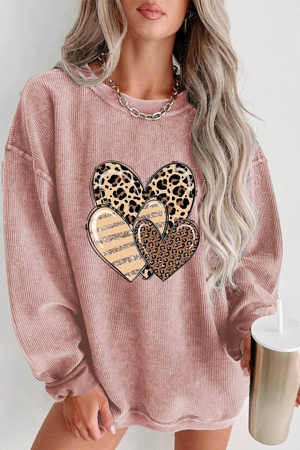 Pink Leopard Heart Shape Corded Loose Fit Sweatshirt