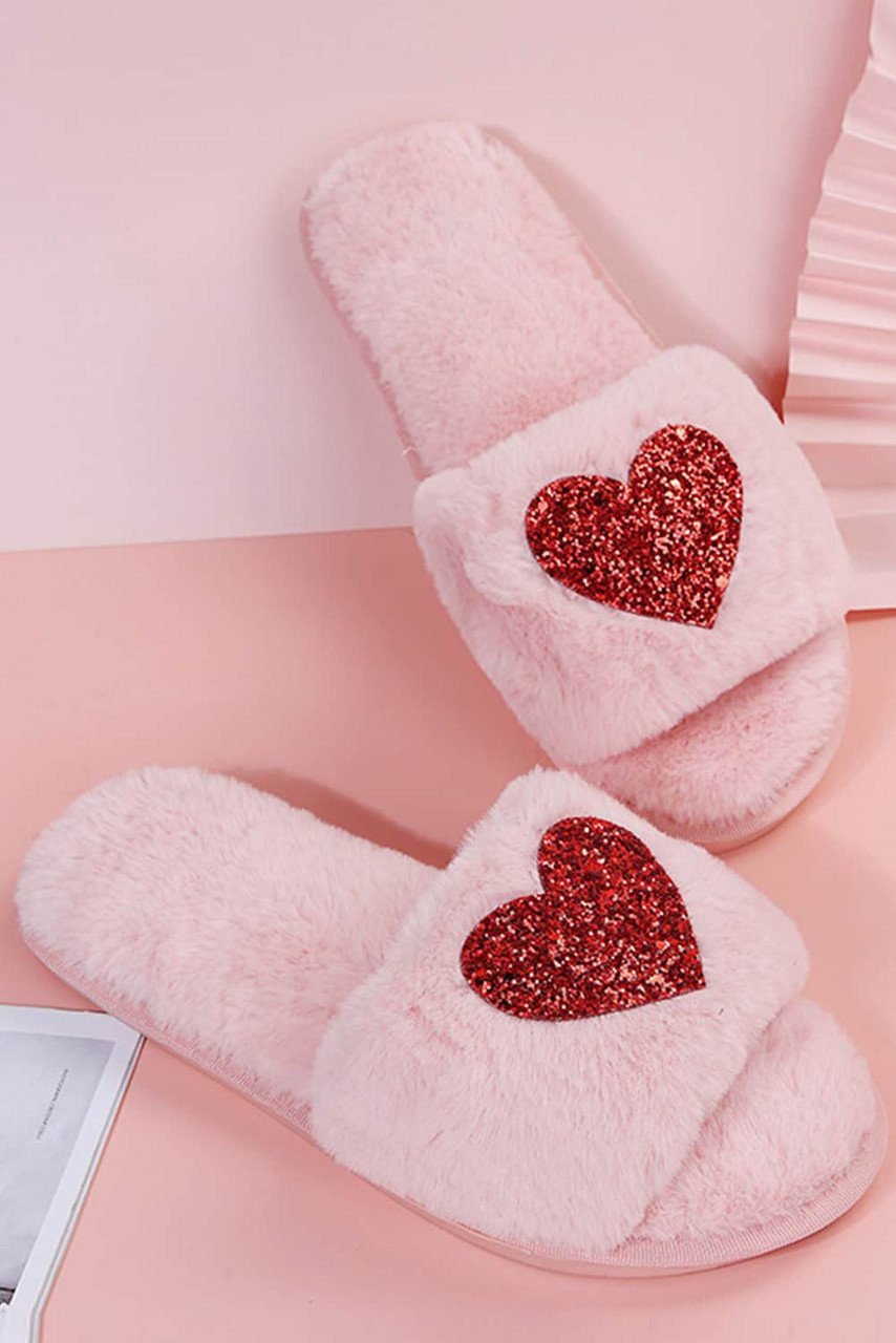 Pink Sequin Heart Shaped Slip On Plush Slippers