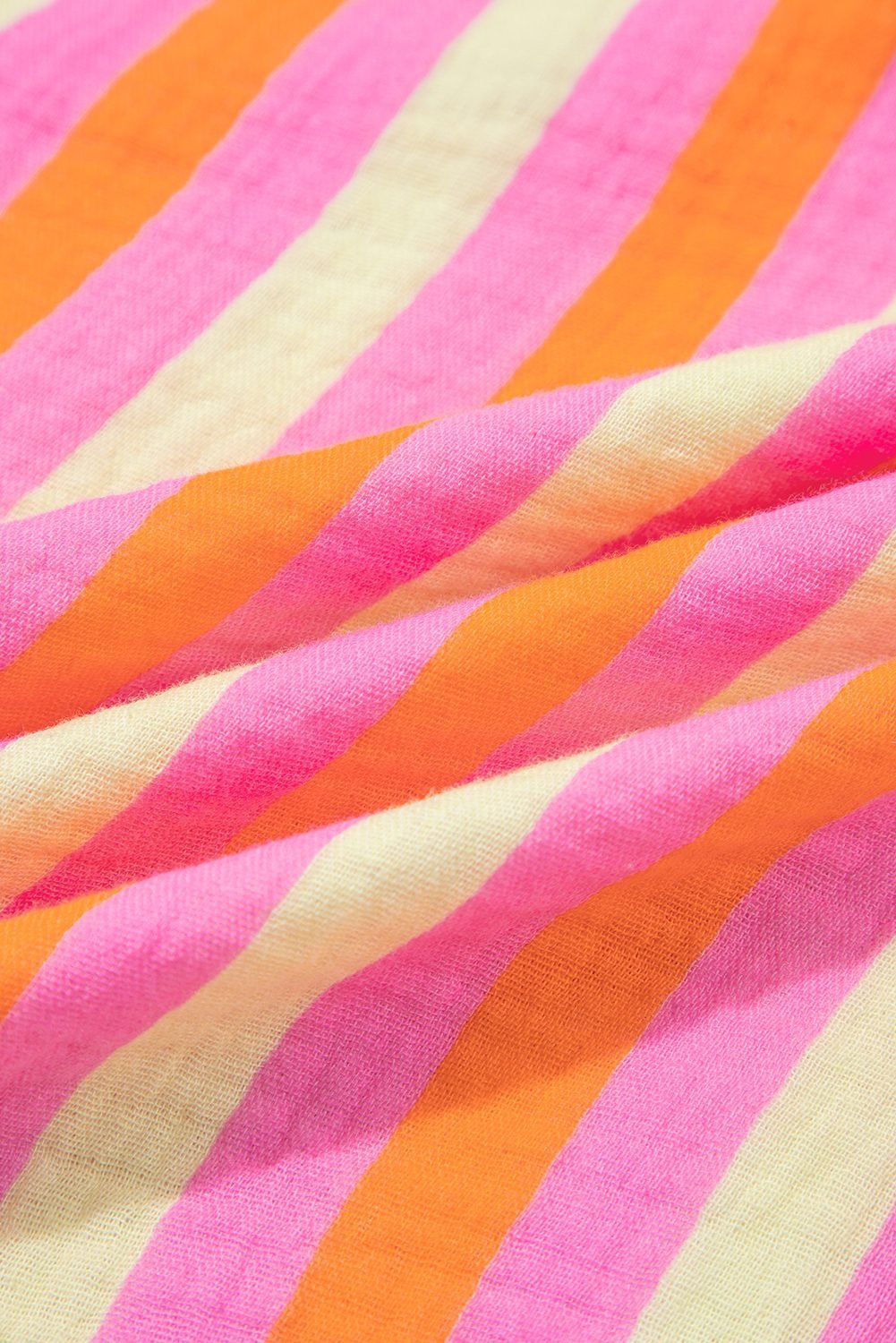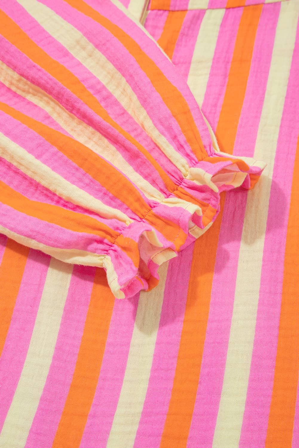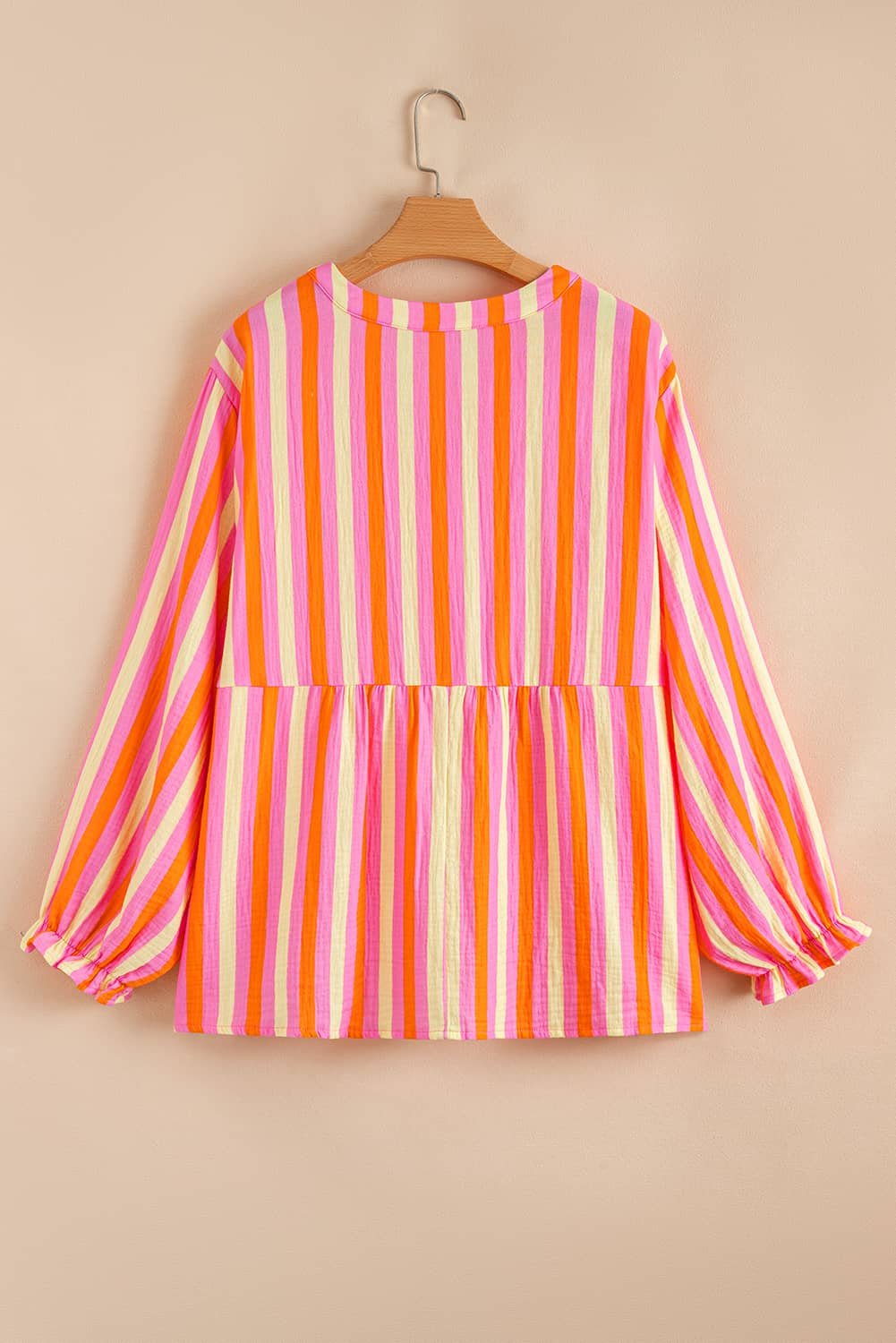 Pink Stripe Crinkled Half Buttons V Neck Plus Size Blouse