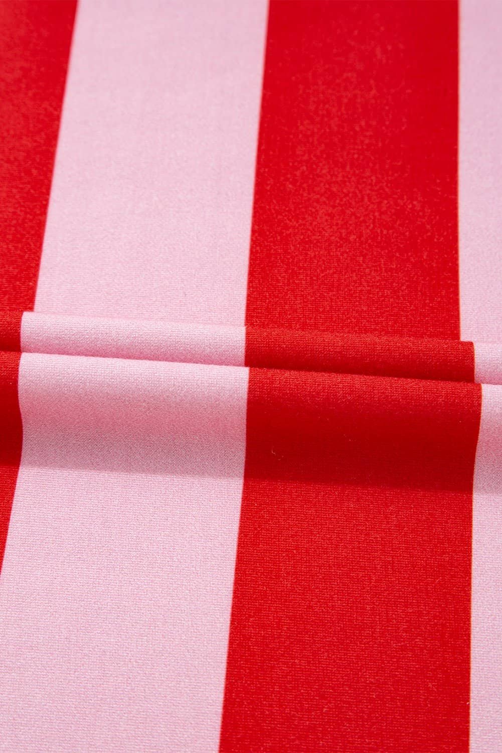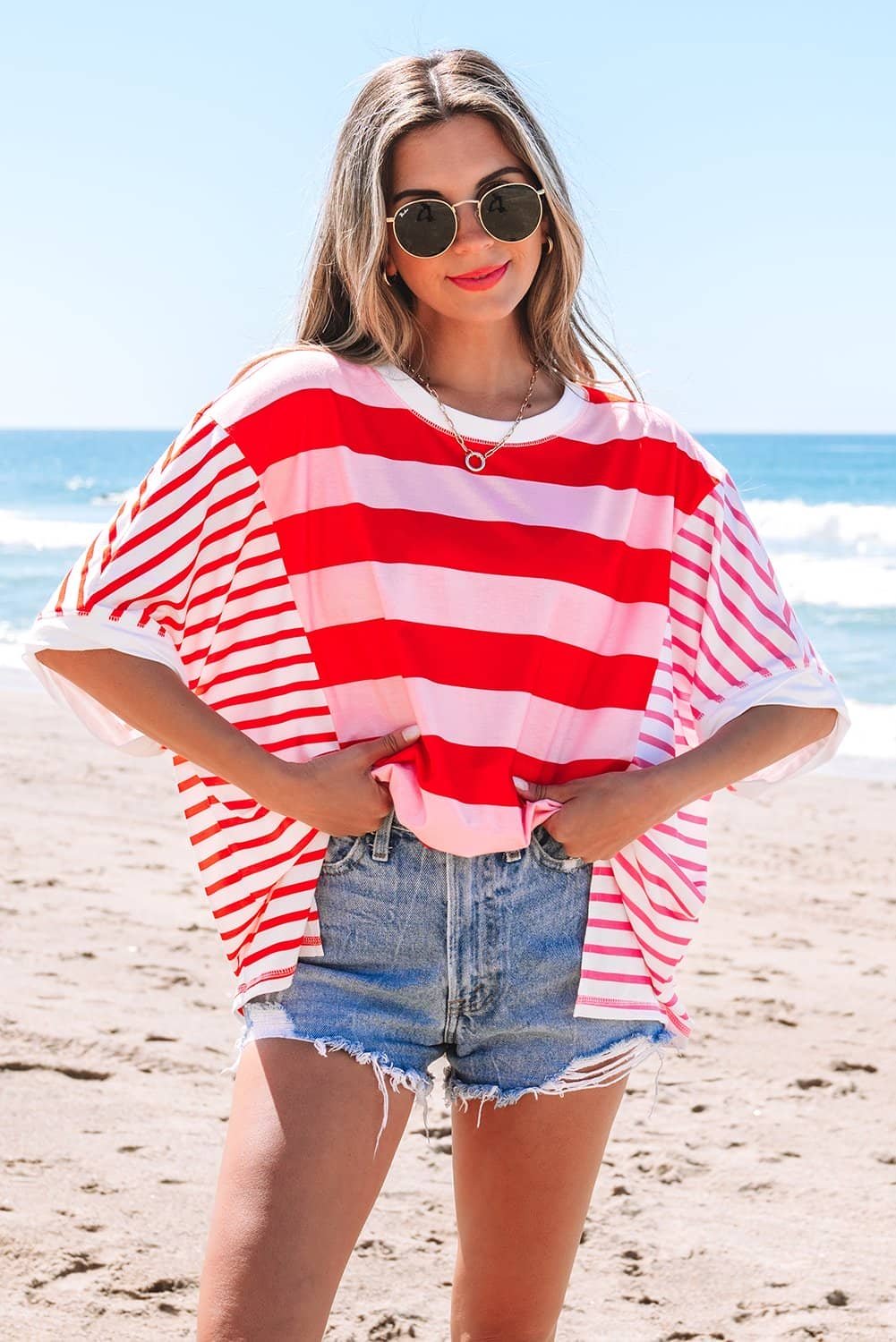 Pink Stripe Patchwork Round Neck Side Split Loose T Shirt