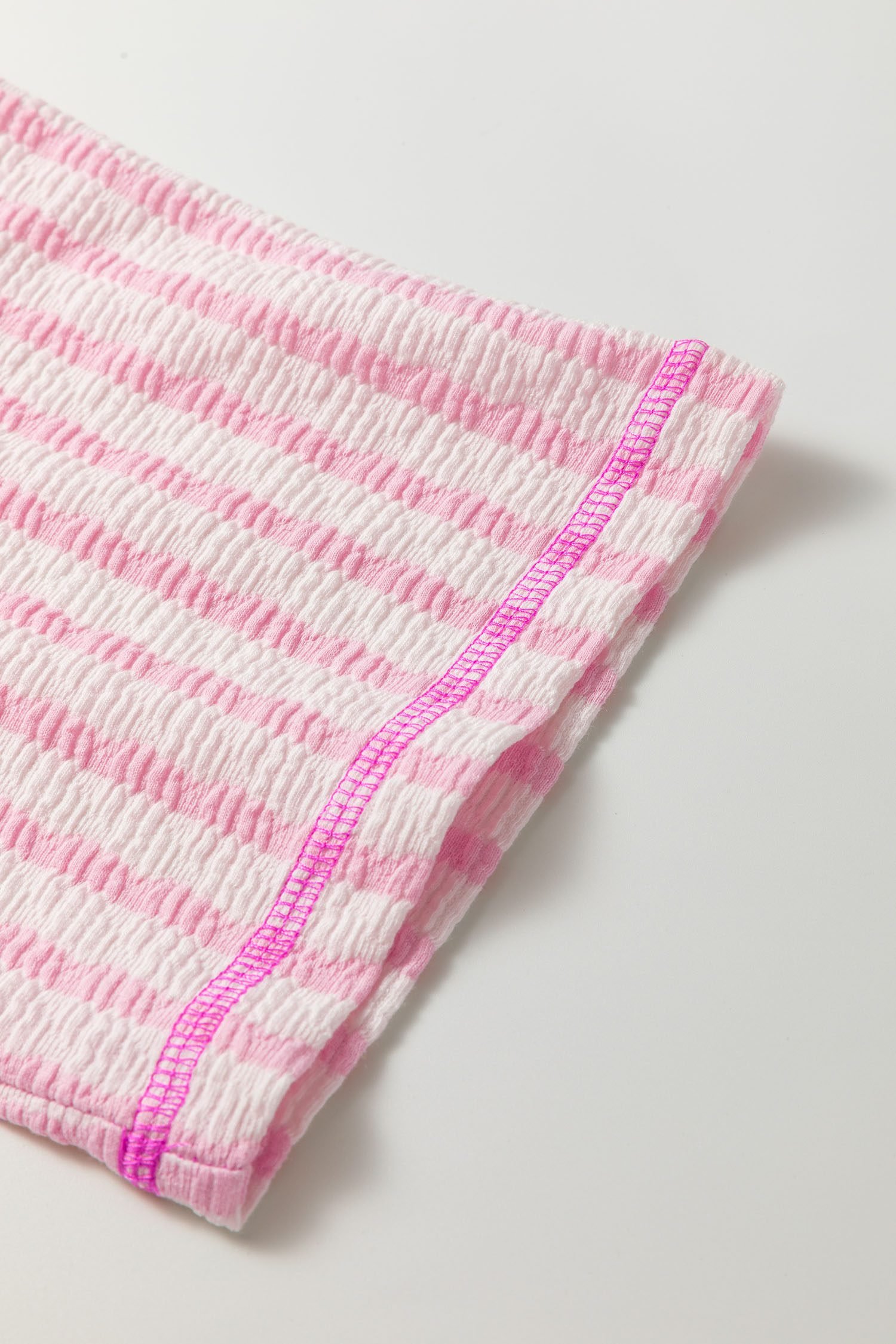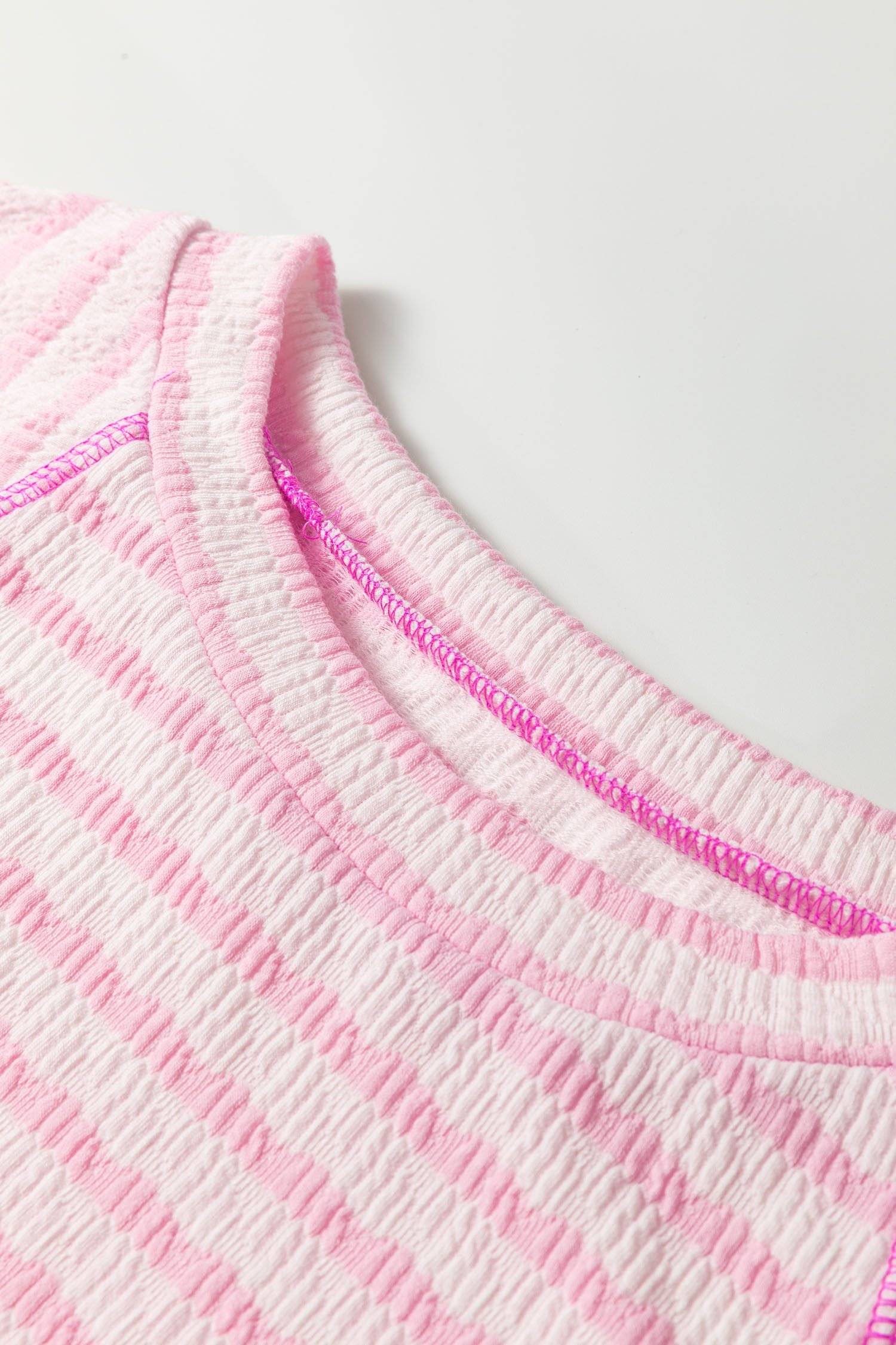 Pink Stripe Textured Knit Split Hem Half Sleeve Loose Top