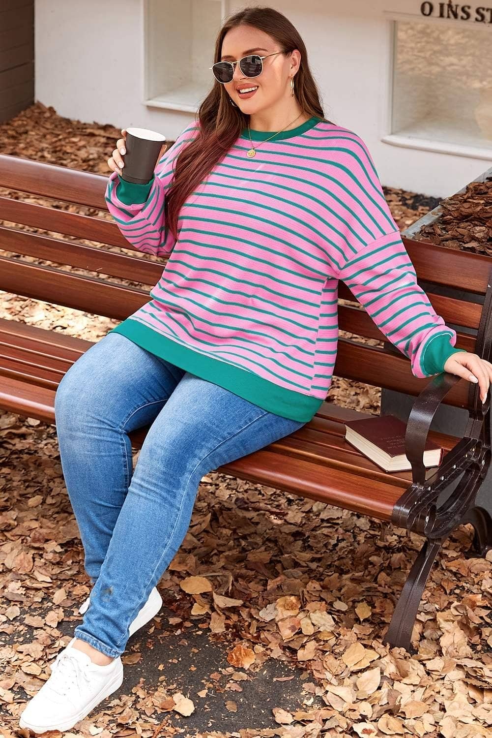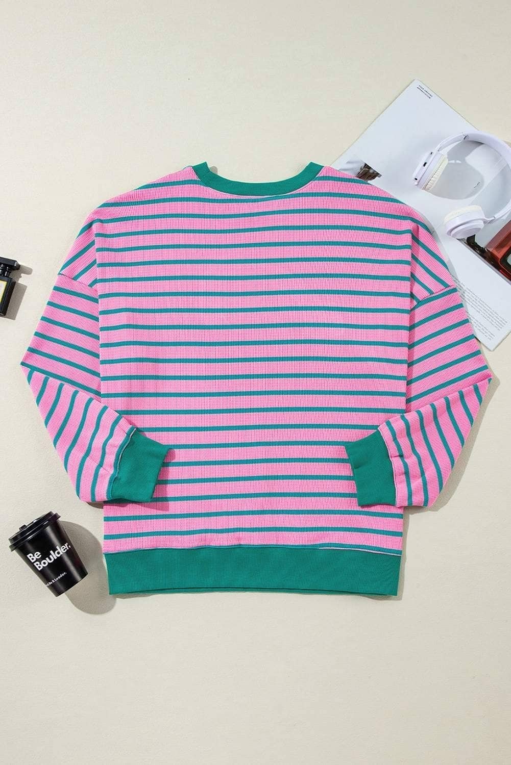 Pink Stripe Waffle Knit Crew Neck Plus Size Sweatshirt