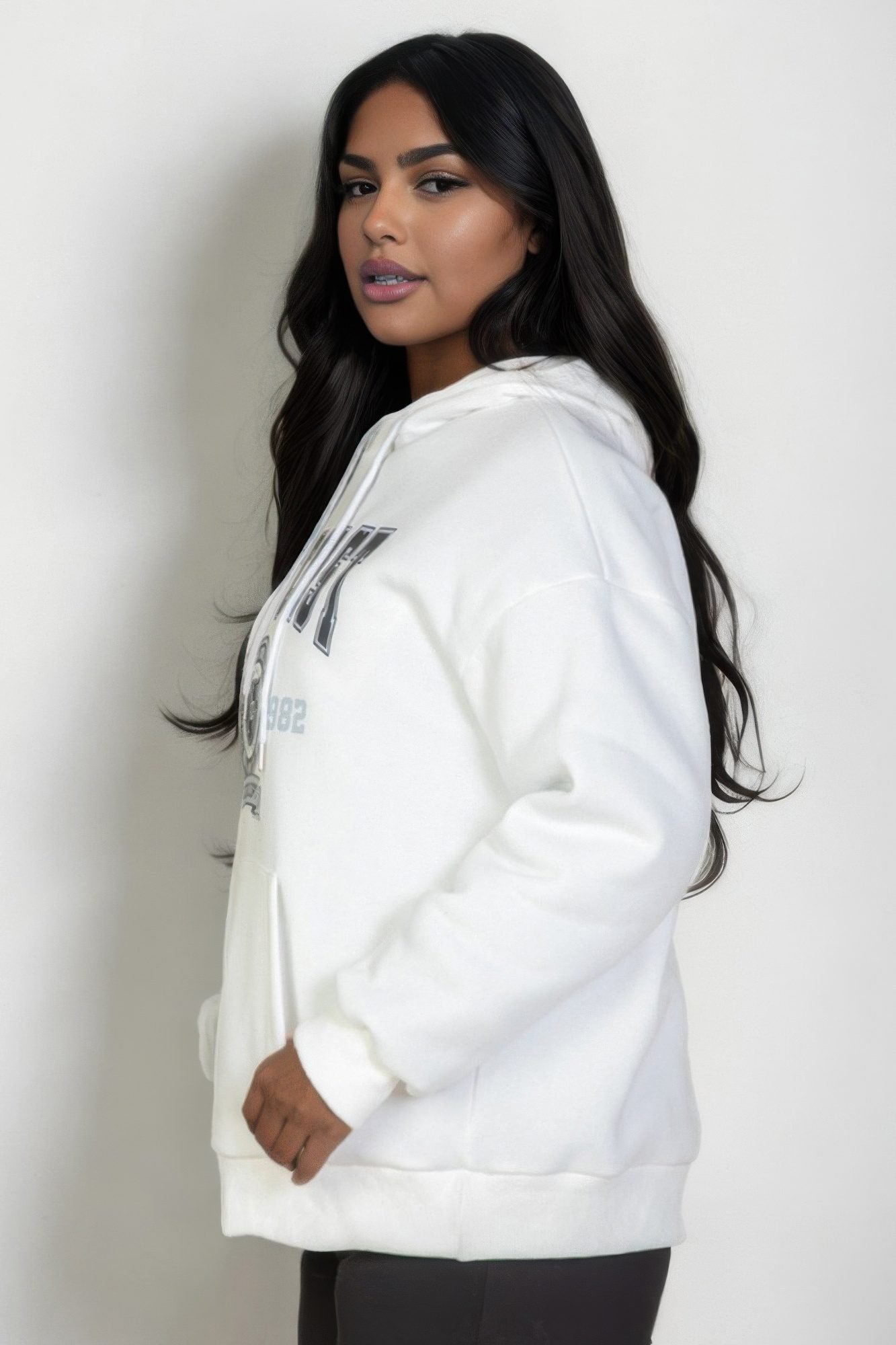 Introducing our Plus Size Graphic Kangaroo Pocket Drawstring Hoodie, designed for ultimate comfort and style. Made from soft, stretchy fabric, this hoodie is perfect for casual outings or cozy days at home. The classic long sleeve and kangaroo pocket design provide a relaxed fit, while the bold Eastcoast logo graphic adds a trendy touch. The drawstring hood and pullover style make this hoodie easy to wear and style, whether you’re running errands, hanging out with friends, or just relaxing. Ideal for fall and winter, this hoodie is a versatile addition to your wardrobe. Key Features: Fabric: Crafted from a soft, stretchy fabric that ensures maximum comfort while providing a flattering fit. Fit: Relaxed, comfortable fit with long sleeves, kangaroo pocket, and a pull-over hoodie design. Color Options: Black, Navy, Red, White Sizes: Available in 1X, 2X, and 3X Design: Features a bold Eastcoast logo graphic across the chest, a kangaroo pocket for practicality, and a drawstring hood for added style and warmth. Versatile Styling: Perfect for layering over a graphic tee or pairing with jeans, leggings, or shorts. This hoodie can be styled for various occasions such as casual outings, sports, and daily wear. Product Details: Comfortable All-Day Wear: The soft, stretchy fabric provides a cozy fit that moves with you, ensuring all-day comfort. Quality Craftsmanship: The high-quality materials and attention to detail ensure this hoodie will remain a wardrobe favorite season after season. Why Choose Plus Size Graphic Kangaroo Pocket Drawstring Hoodie This hoodie combines comfort, style, and practicality. With its relaxed fit and bold graphic design, It’s the perfect piece for women who want to stay cozy while making a fashionable statement. Ideal Occasions: Perfect for school, work, sports, casual outings, shopping, or relaxing at home. It’s an essential for fall and winter wardrobes.