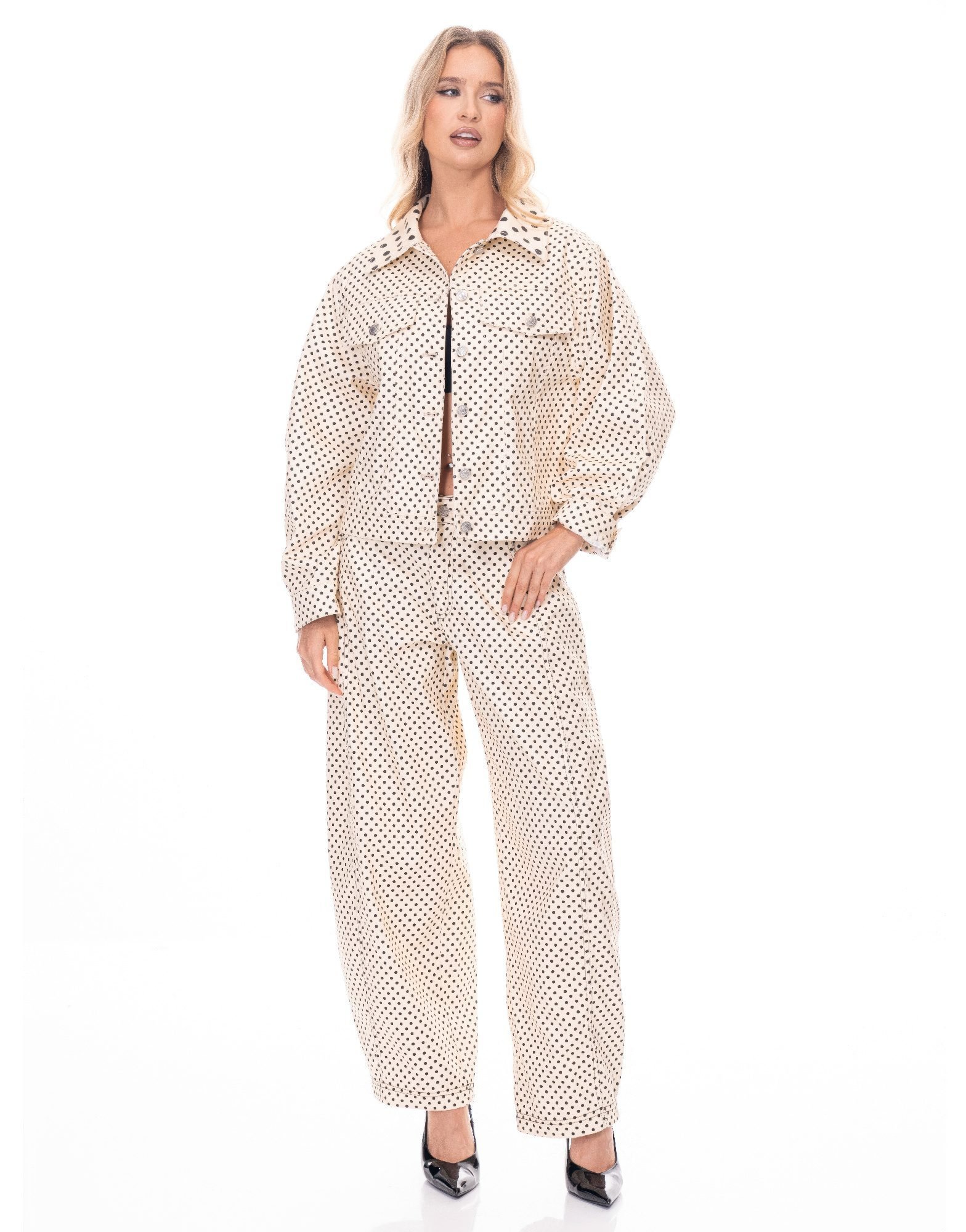 Product Description:Playful yet polished, these Polka Dot Pants bring a timeless print to a modern silhouette. Made from a soft, stretchy blend of polyester and spandex, they offer a comfortable fit with a tailored look. The allover polka dot design adds a fun, graphic element, making them perfect for both standout statements and everyday wear. Pair them with the matching jacket for a coordinated set or style them solo with your favorite basics. Imported and versatile, they’re a fresh take on classic pattern dressing.Product Details:Imported95% polyester, 5% spandex for comfort and stretchAllover polka dot print for a playful yet refined lookSlim, flattering fit with soft structureCoordinates perfectly with matching jacket (sold separately)Ideal for office wear, casual days, or evening looksSize Guide:For accurate sizing guidance, please review our size chart available on the website.Shipping and Returns:Fast Shipping: We offer speedy delivery to your doorstep.Hassle-Free Returns: If you’re not completely satisfied, our flexible return policy ensures your peace of mind.