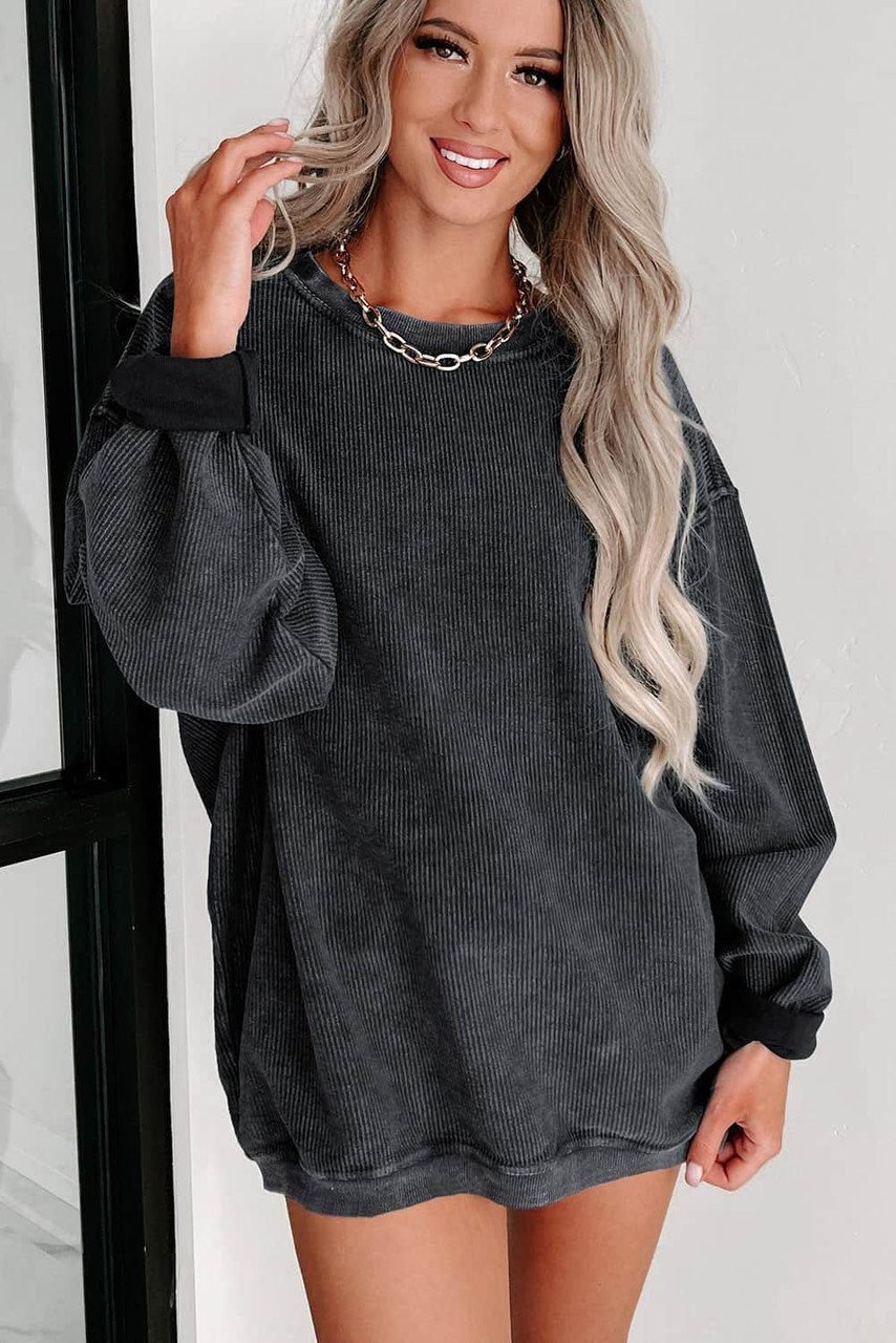 Black Solid Ribbed Knit Round Neck Pullover Sweatshirt