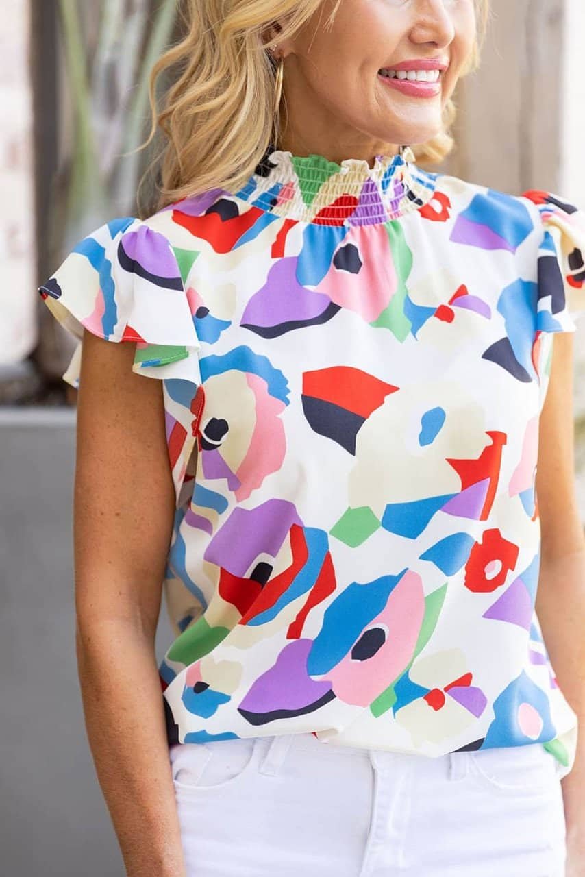 Be the first to review “Multicolor Abstract Print Ruffle Sleeve Smocked Blouse”