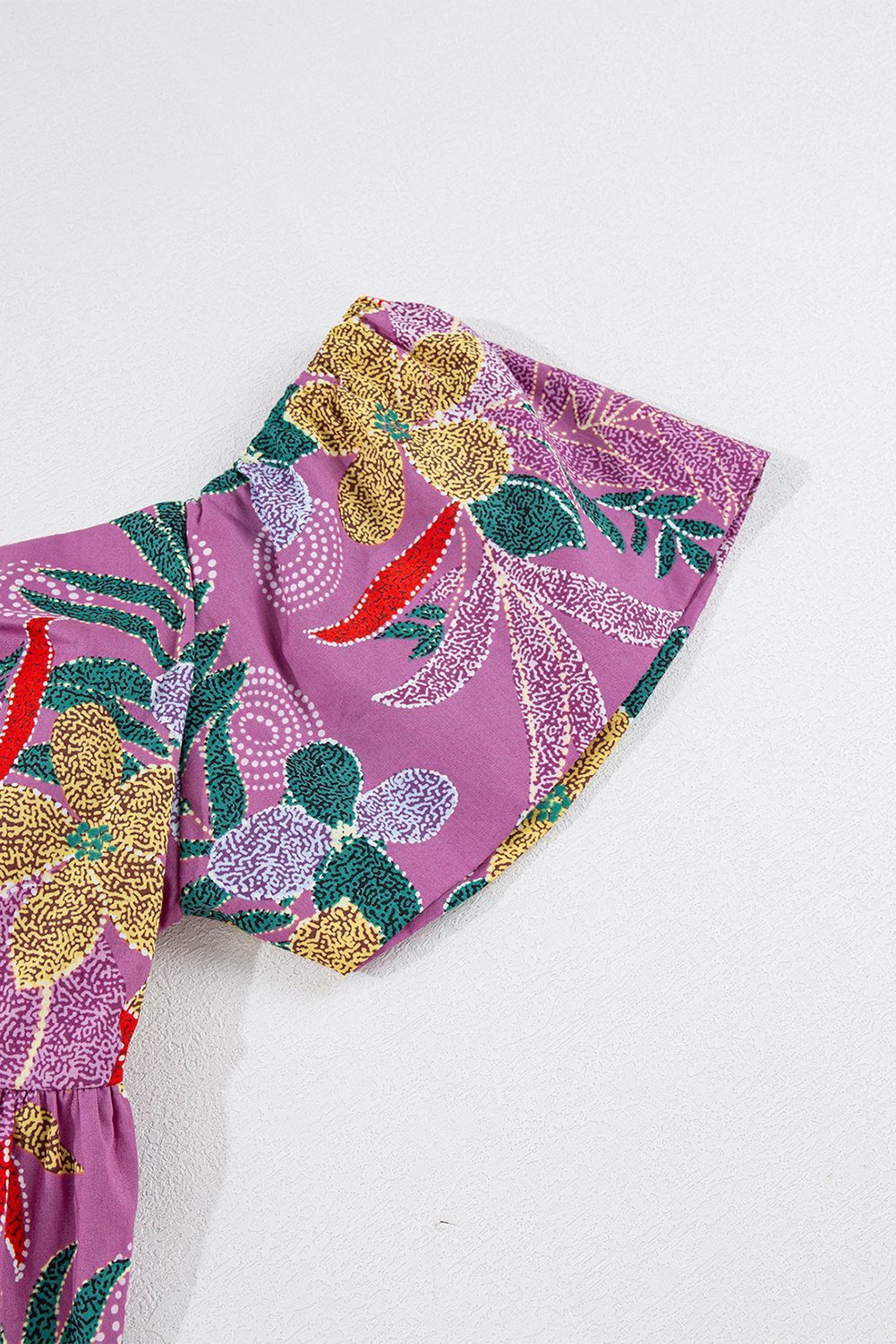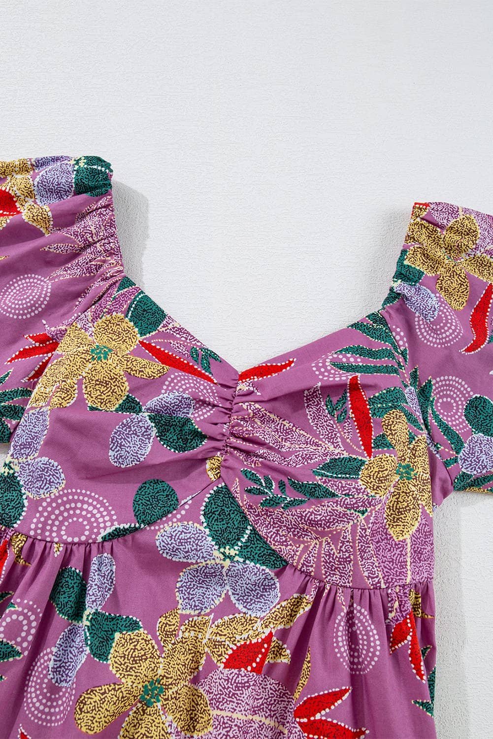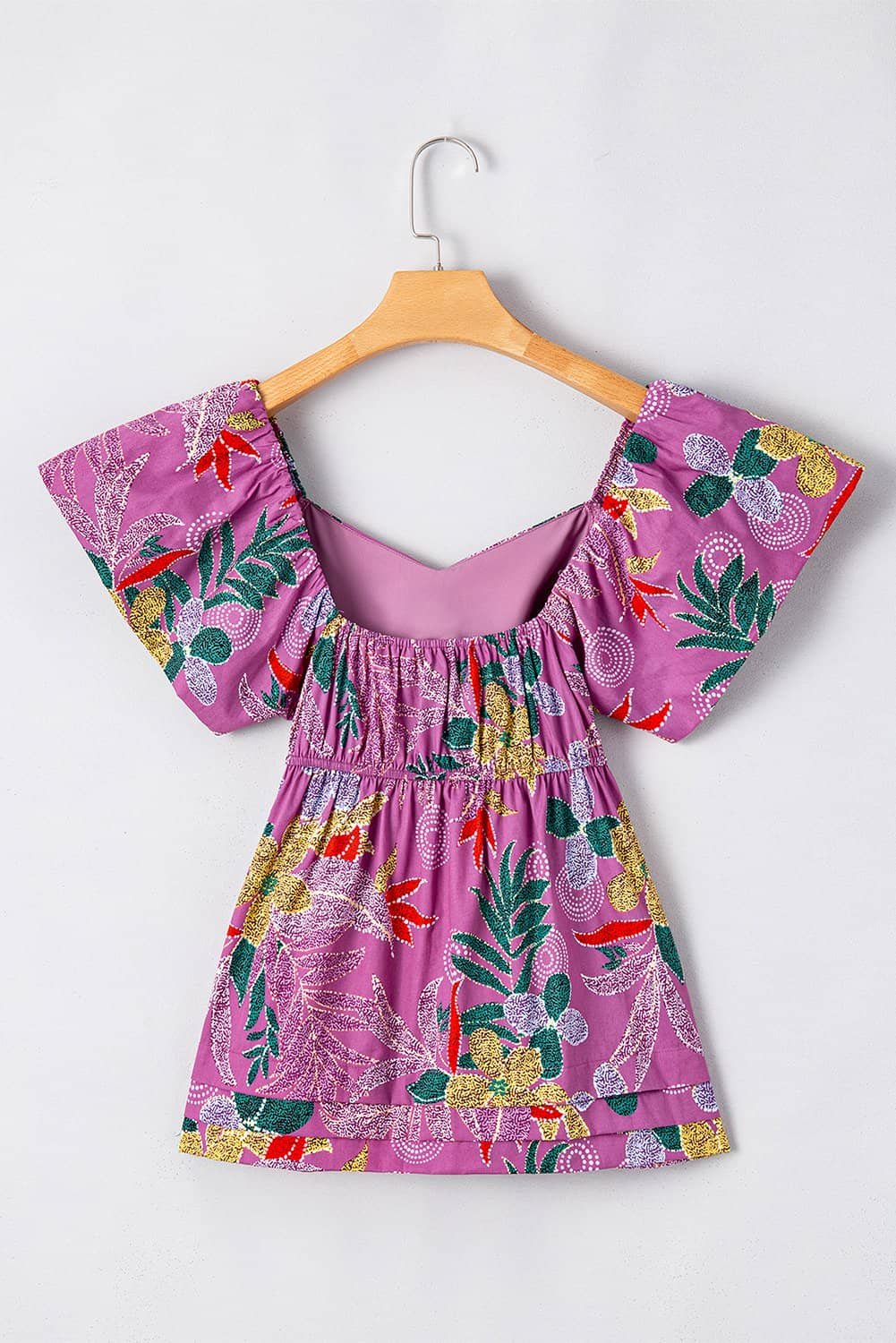 Sweetheart neckline, flutter short sleeves, and slightly flared hem.