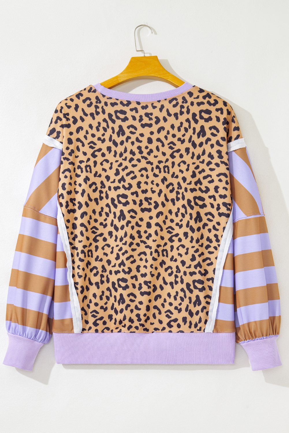 - Trendy leopard print plus size sweatshirt with bold striped patchwork design.
