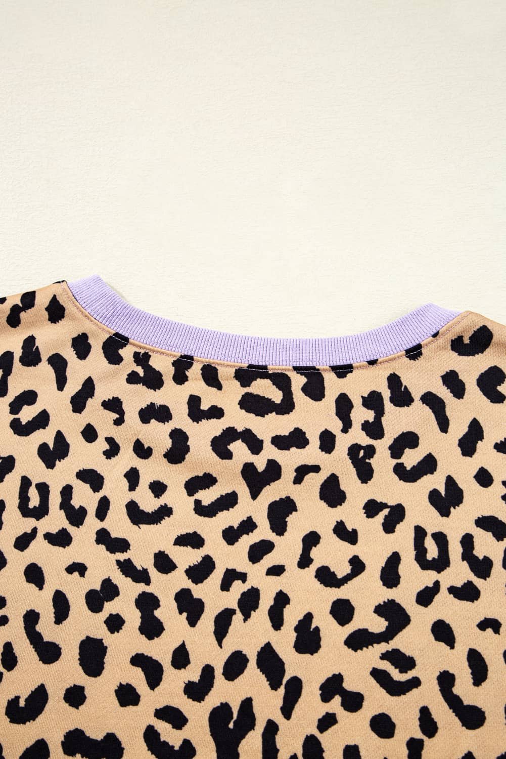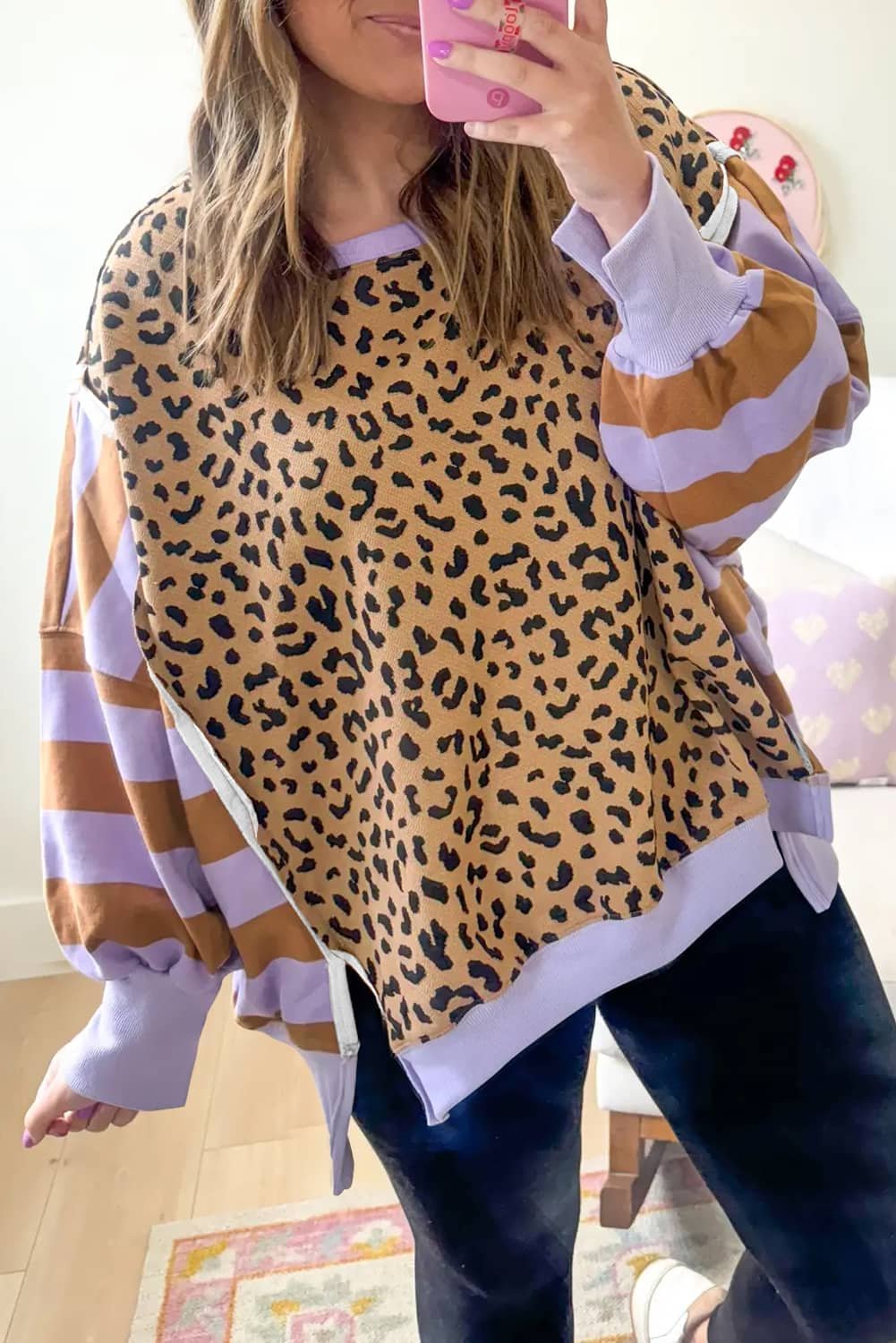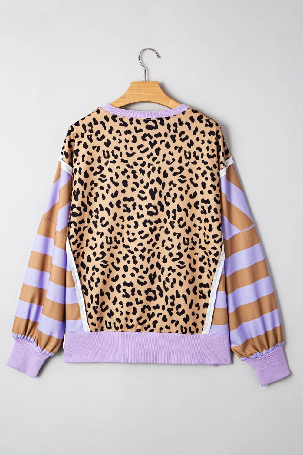 It features a leopard silhouette with striped colorblock sleeves.