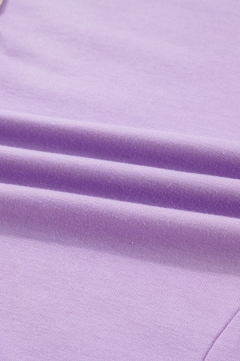 Henley style neckline, dropped shoulder look, and a loose fit.