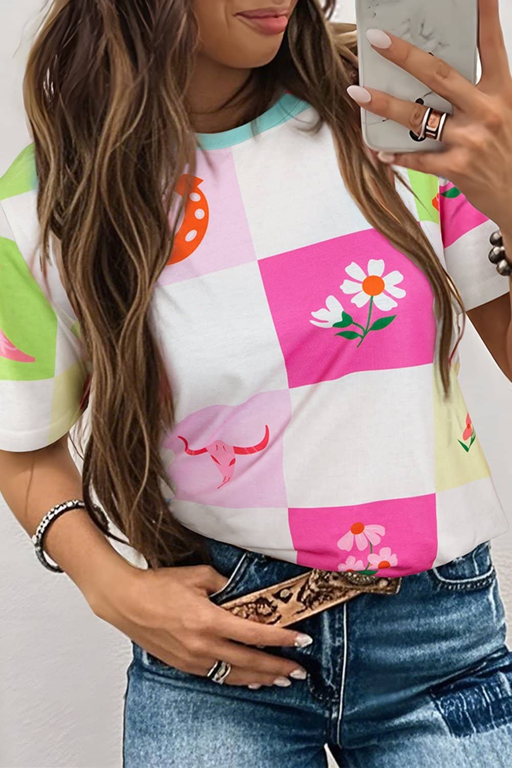 This checker t shirt is unique with western print detail.
