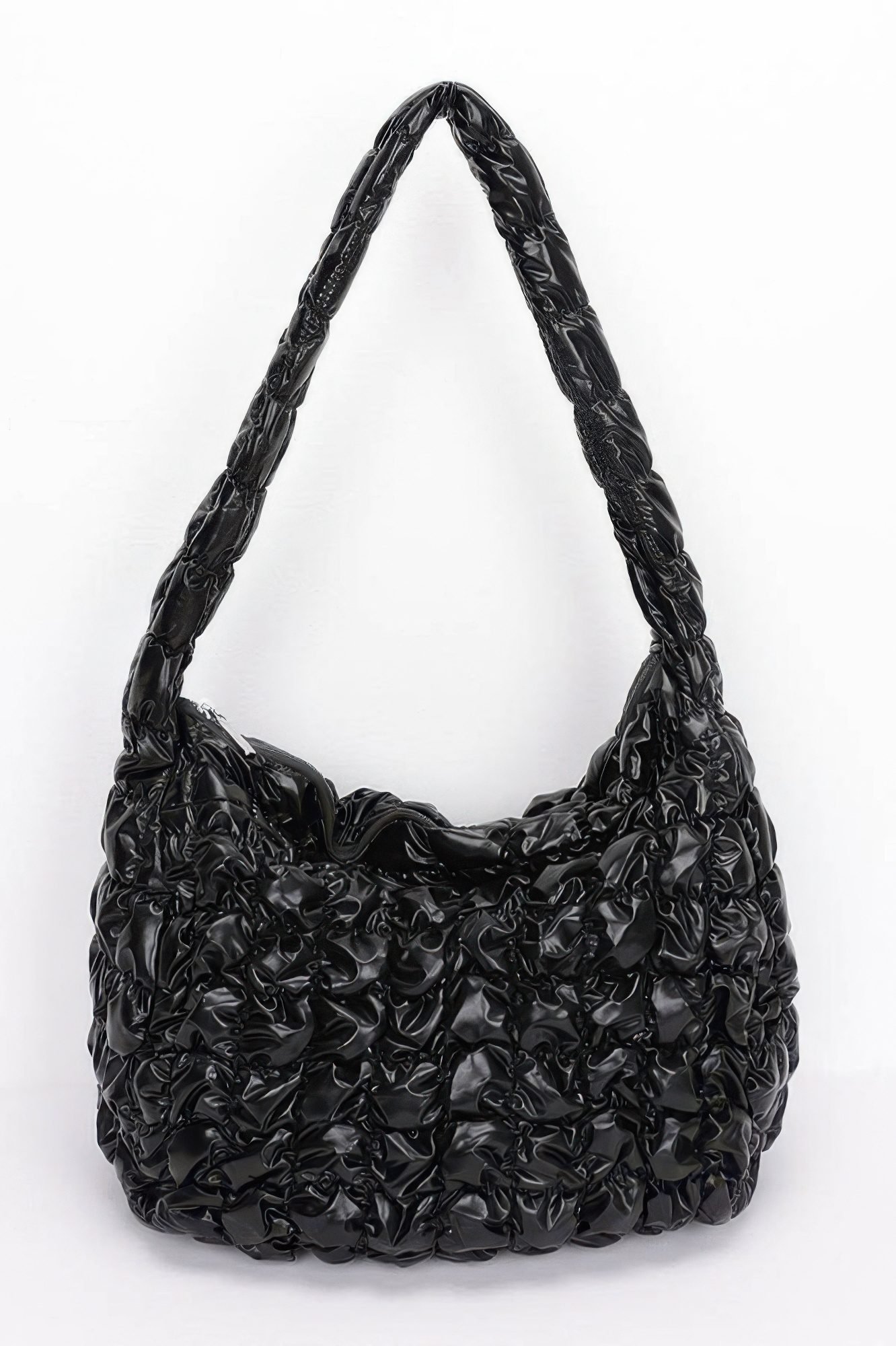 Add shine to your accessory collection with the Quilted Metallic Padded Crossbody Bag. Crafted from a metallic polyurethane blend, this statement piece features a quilted design with an oversized handle for a bold finish. Sleek yet functional, it’s the perfect companion for evenings out or occasions when you want to stand out.