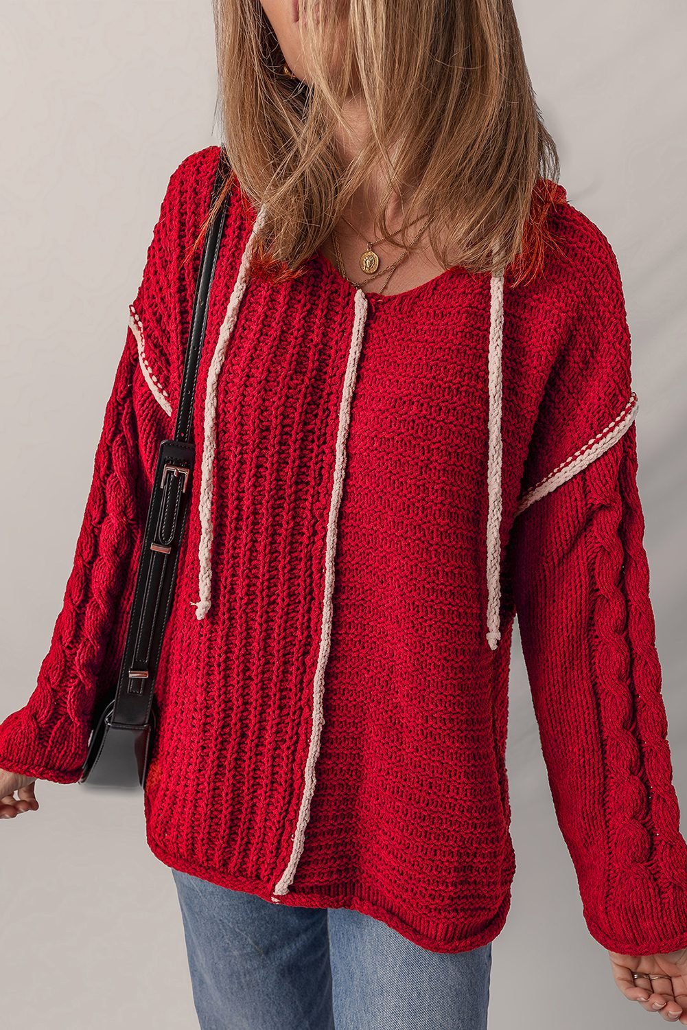 - Contrast trim adds a bold, modern edge to this cozy knit hooded sweater.