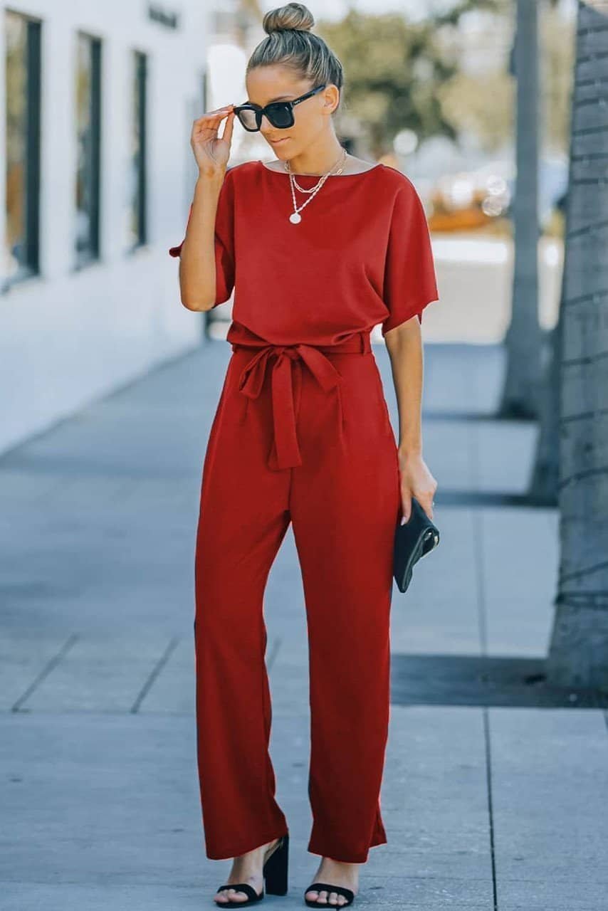 - This jumpsuit for women features a tie waist belt, batwing sleeve and wide leg