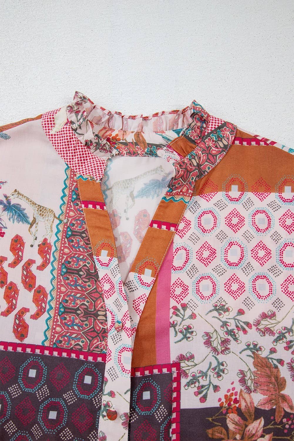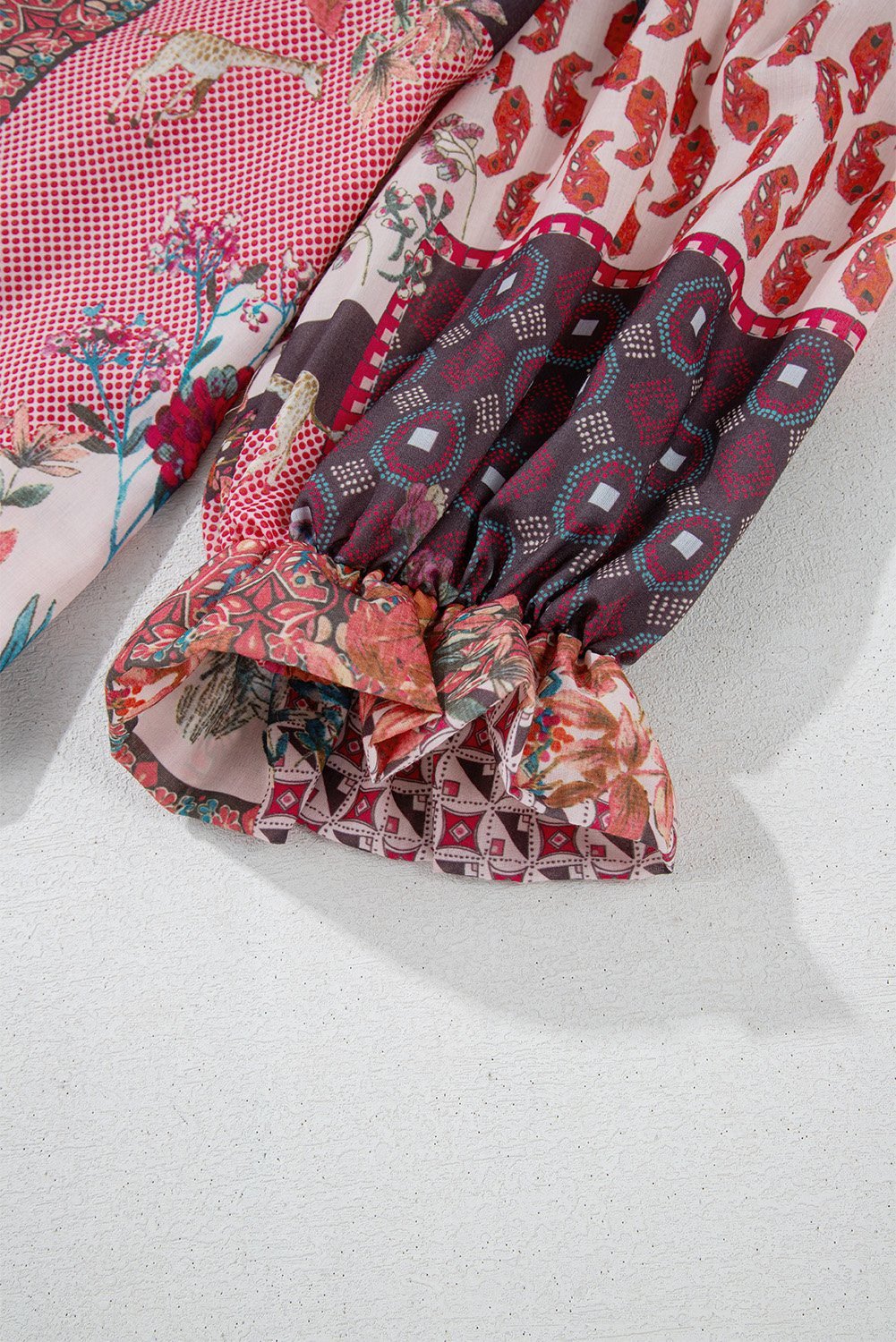 Red Boho Geometric Mixed Print Patchwork Bubble Sleeve Shirt