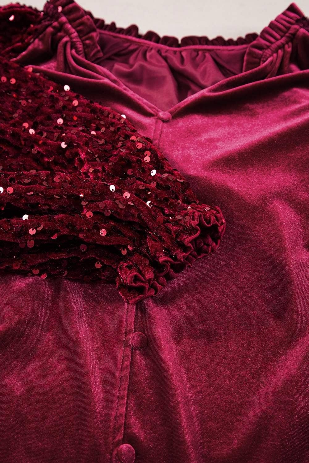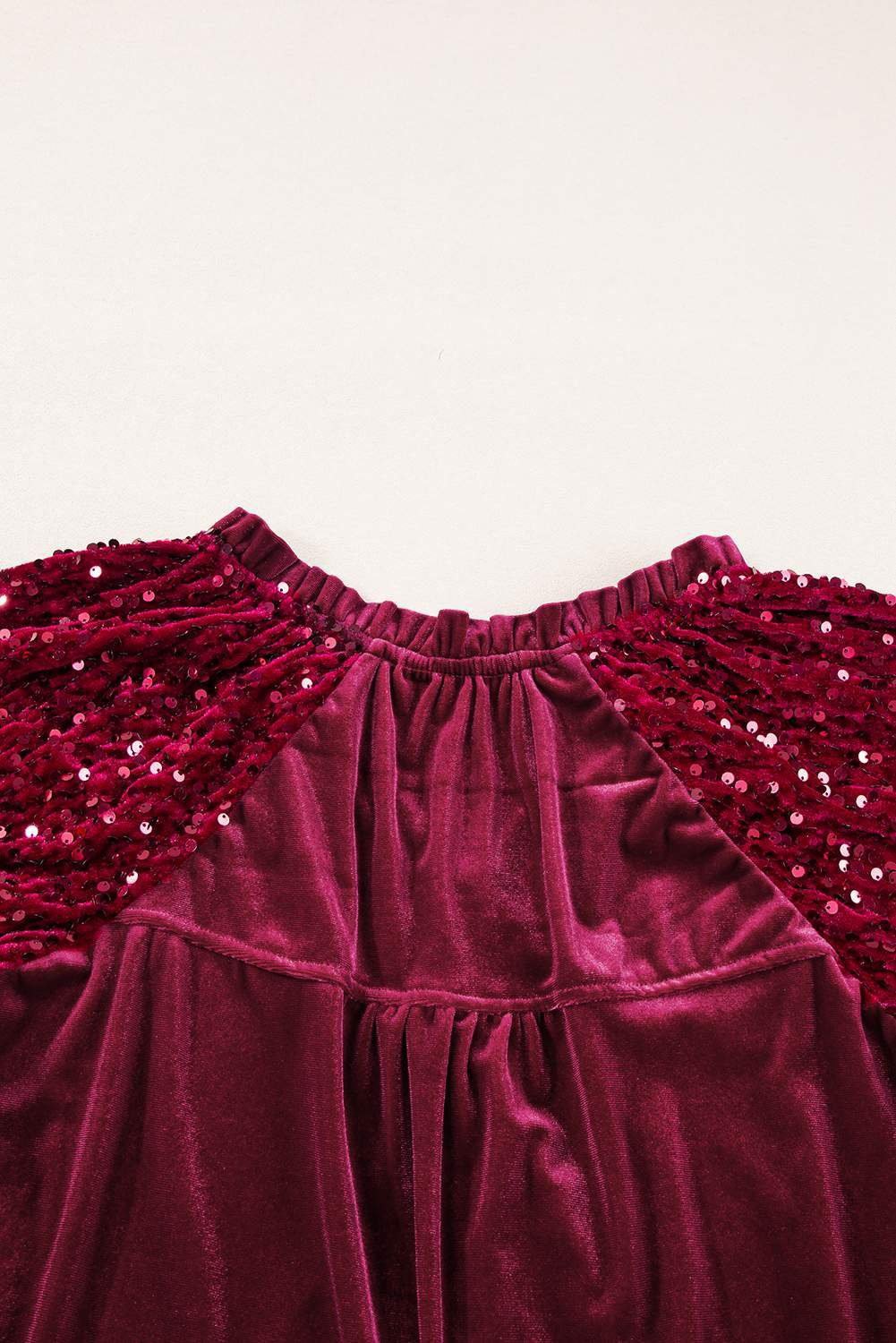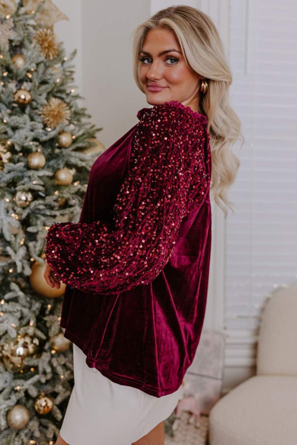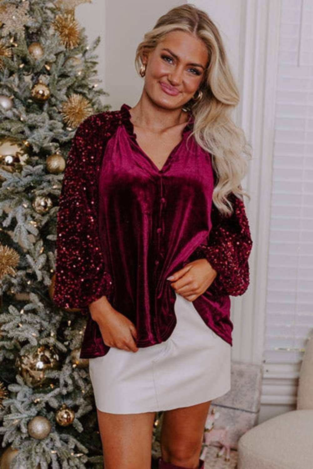 Red Dahlia Sequin Patchwork Sleeve Button Up Velvet Top