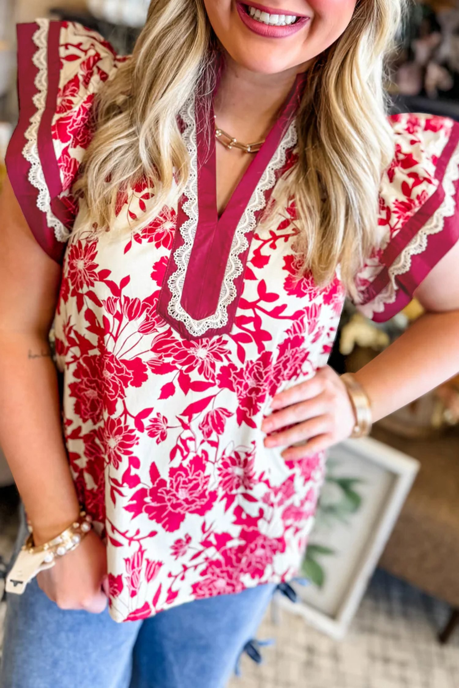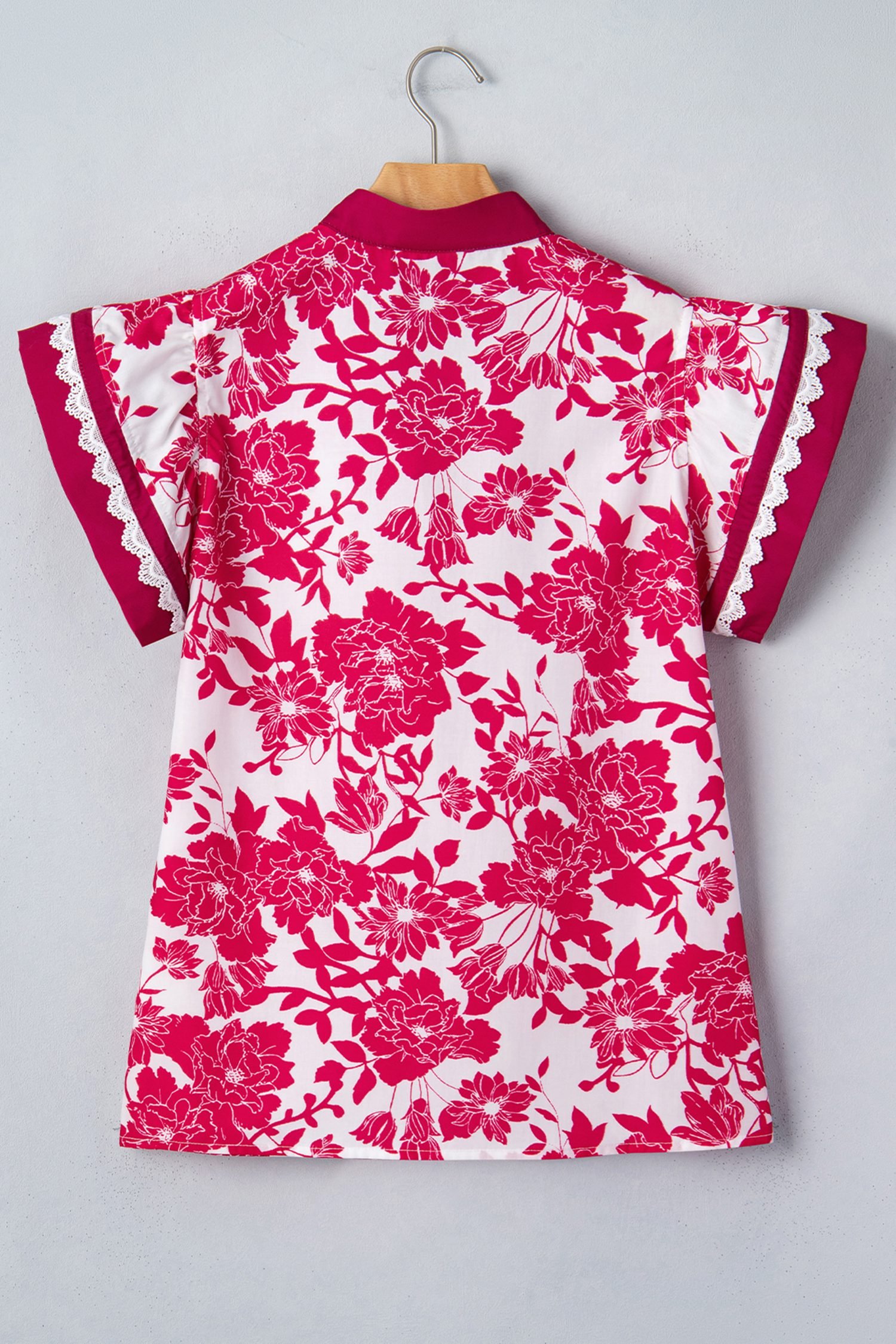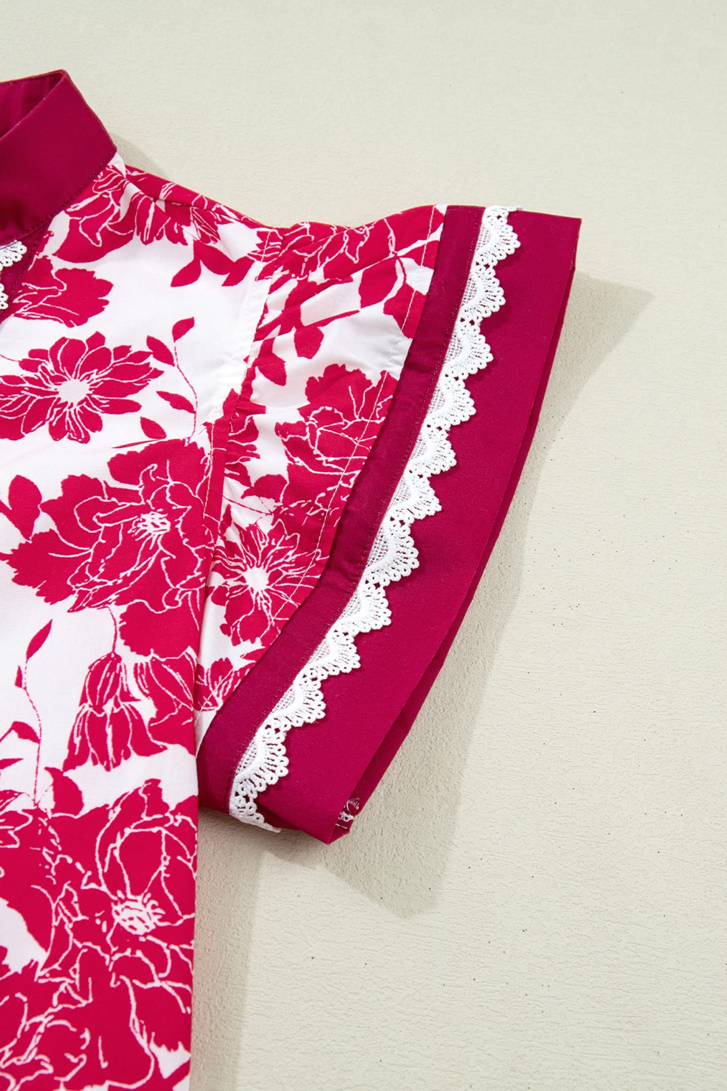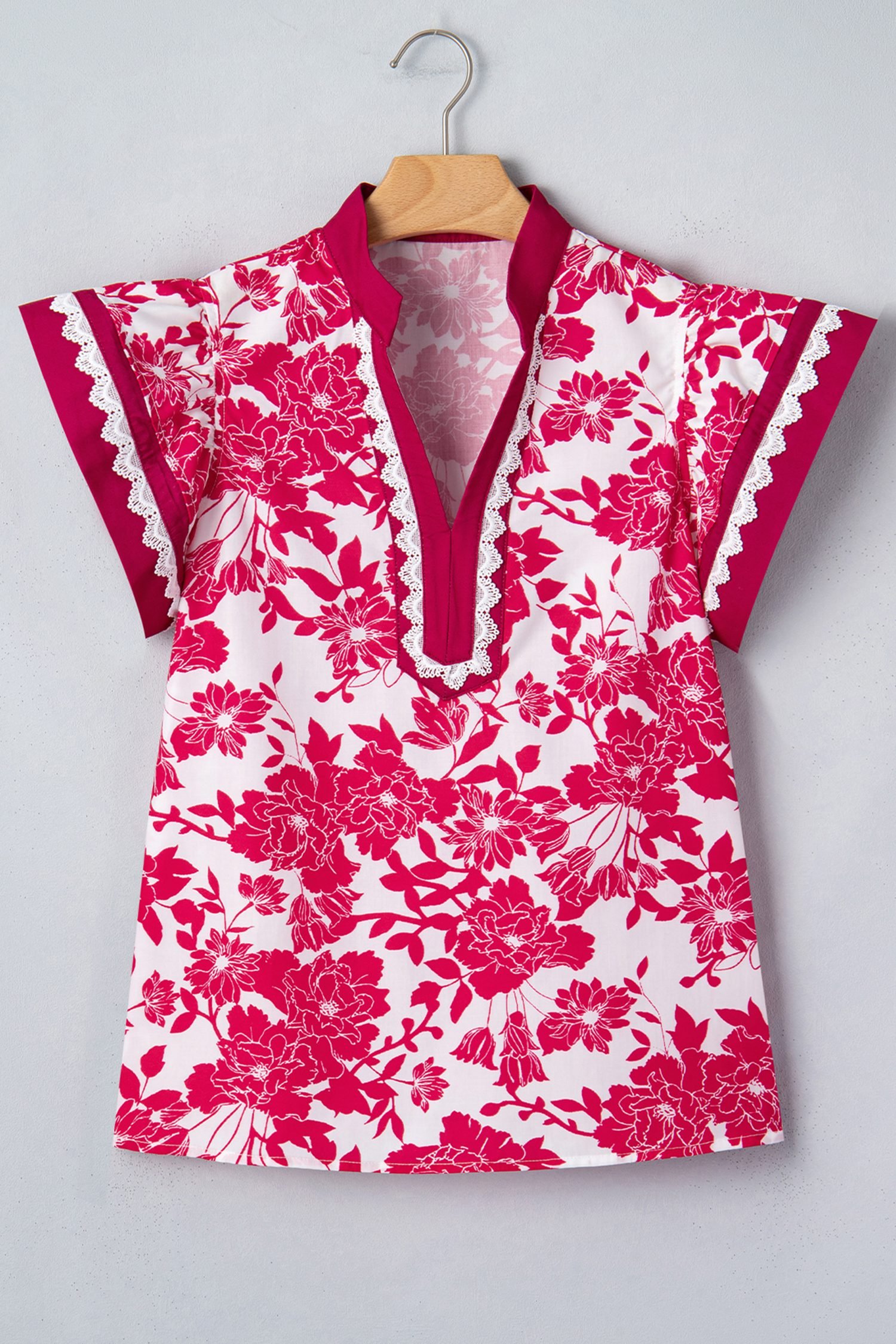 Red Floral Print Color Block Trim Lace Detail V Neck Flutter Sleeve Blouse