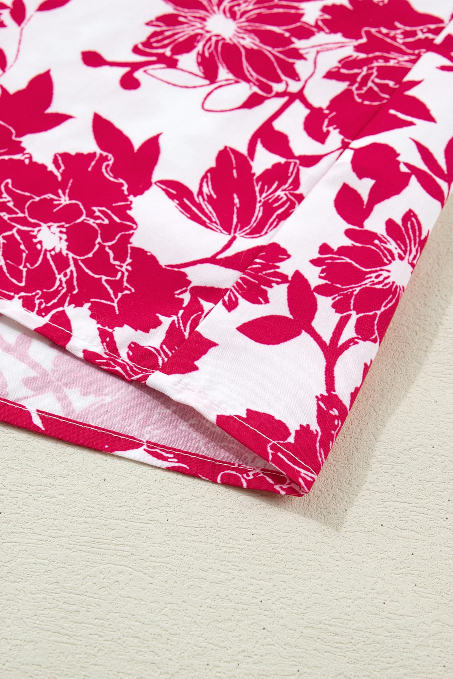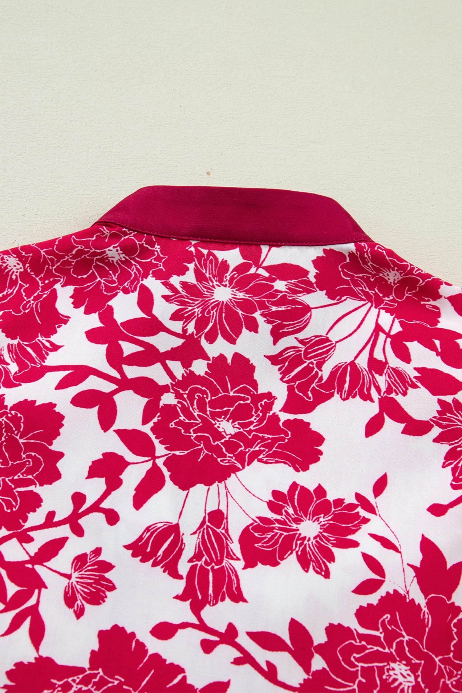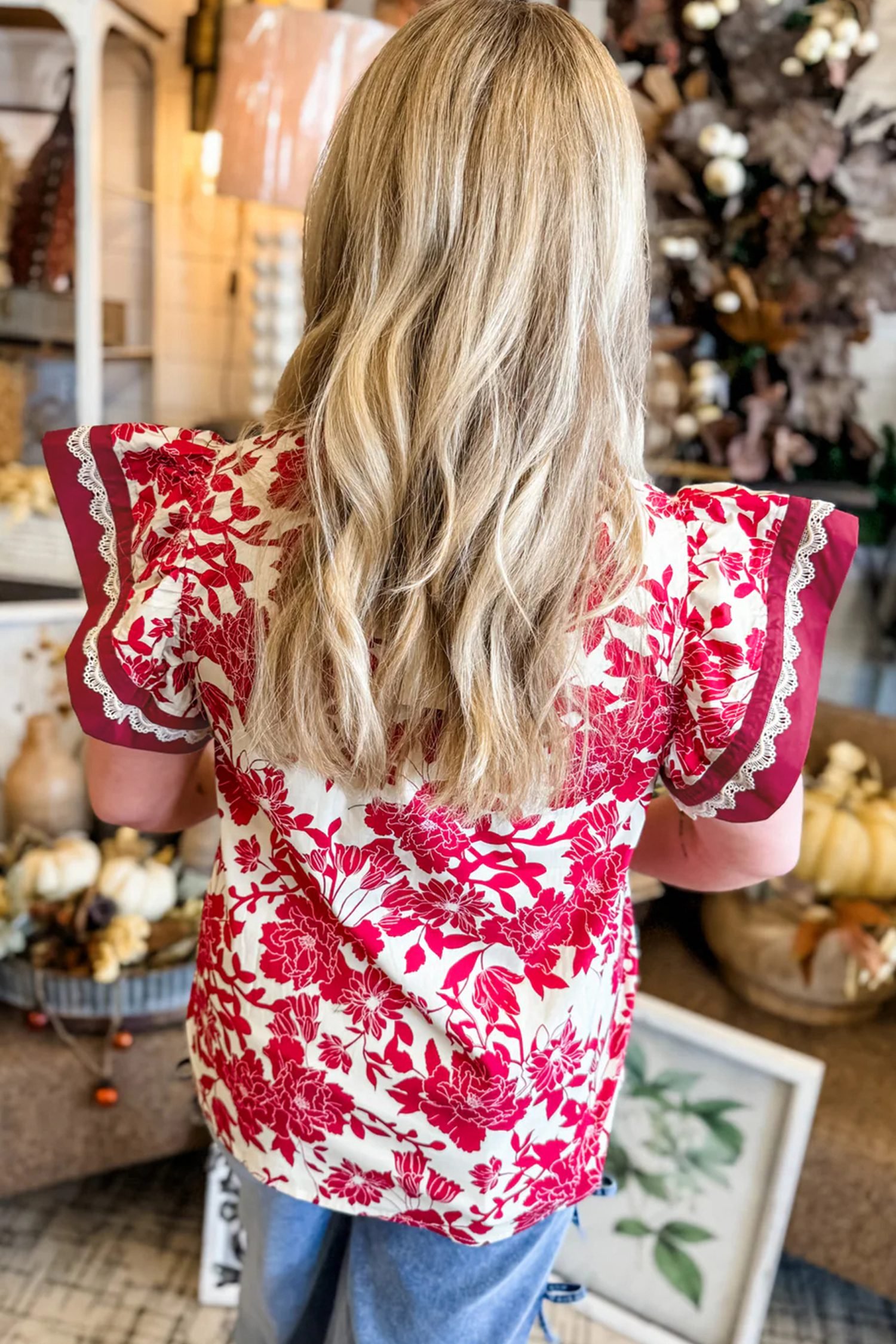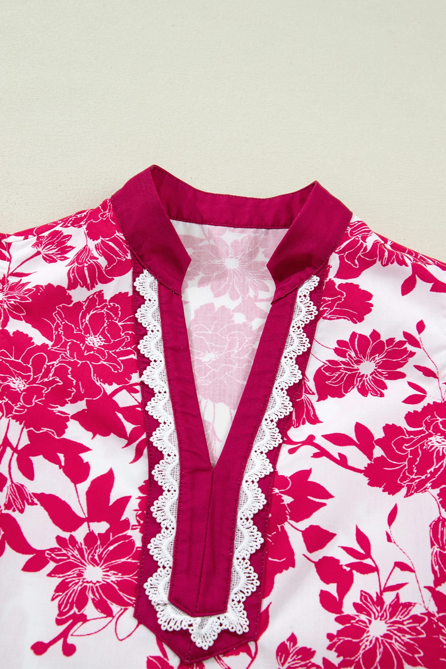 Red Floral Print Color Block Trim Lace Detail V Neck Flutter Sleeve Blouse