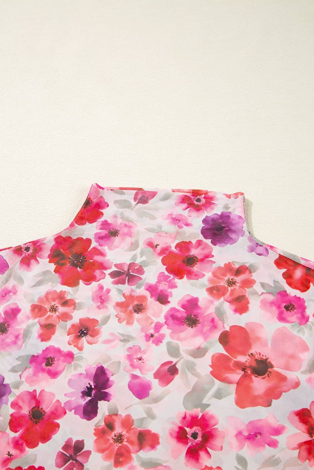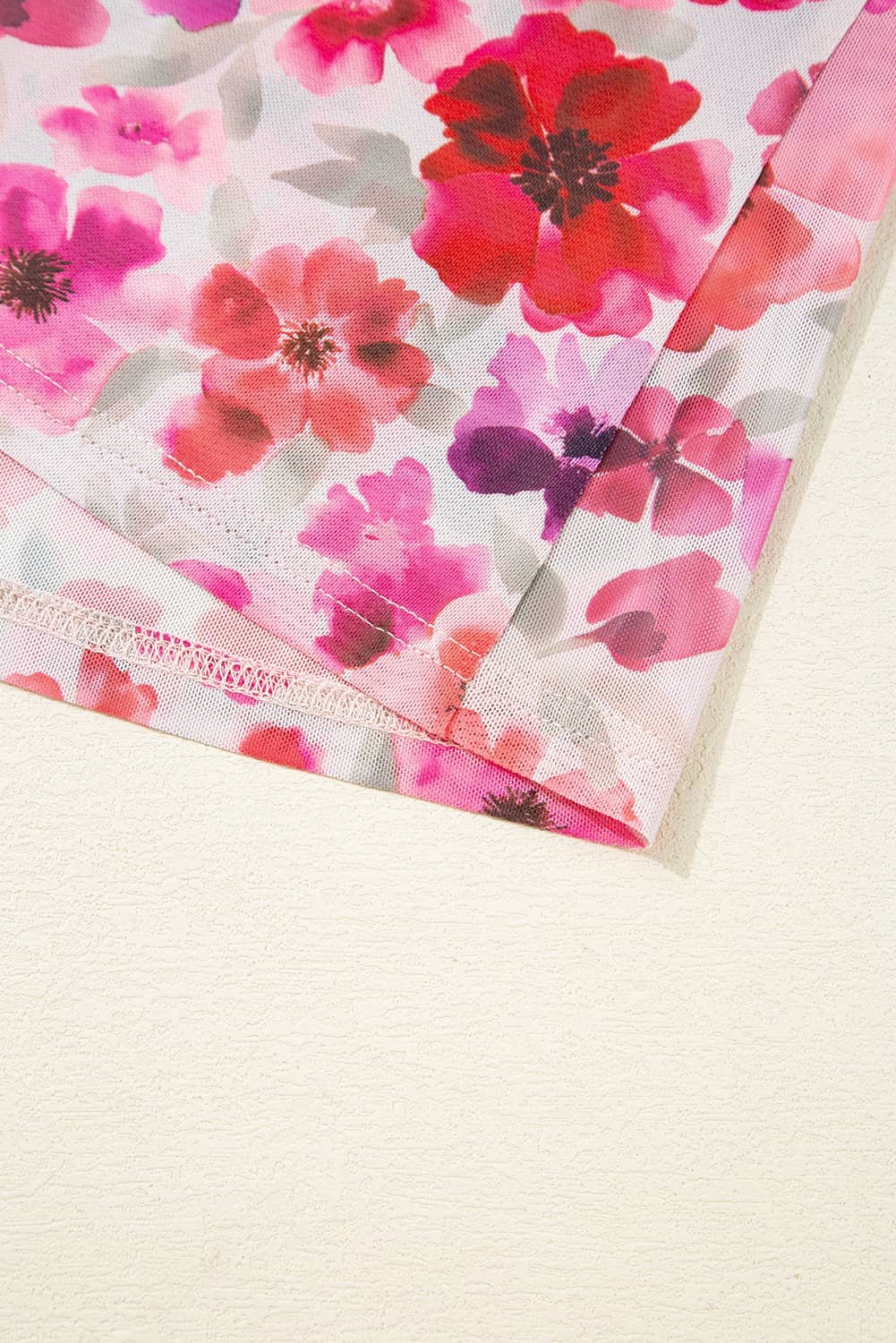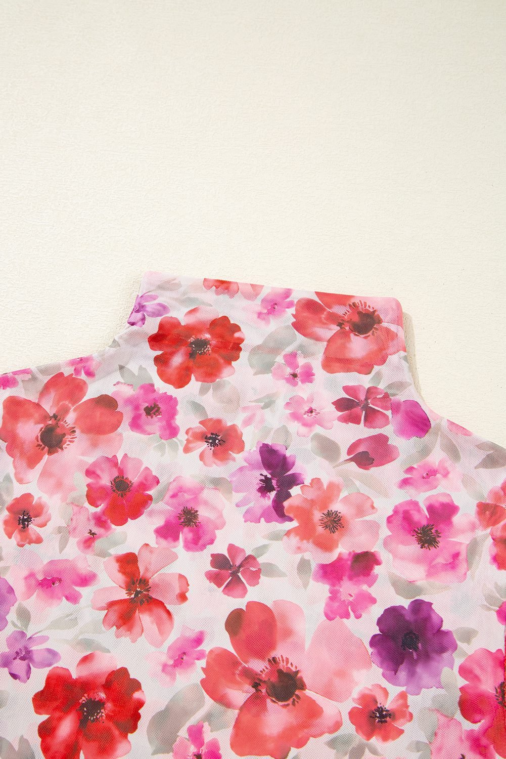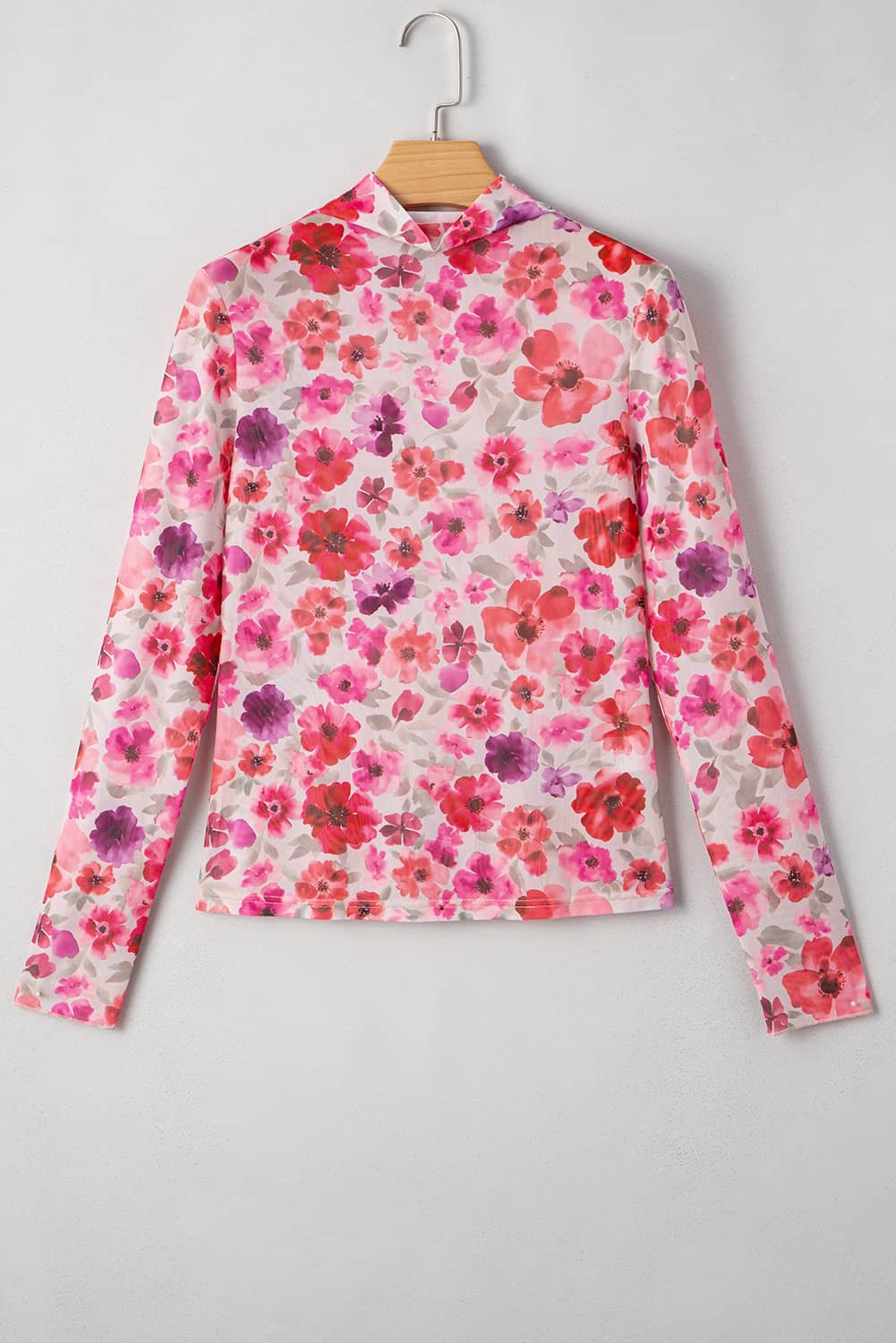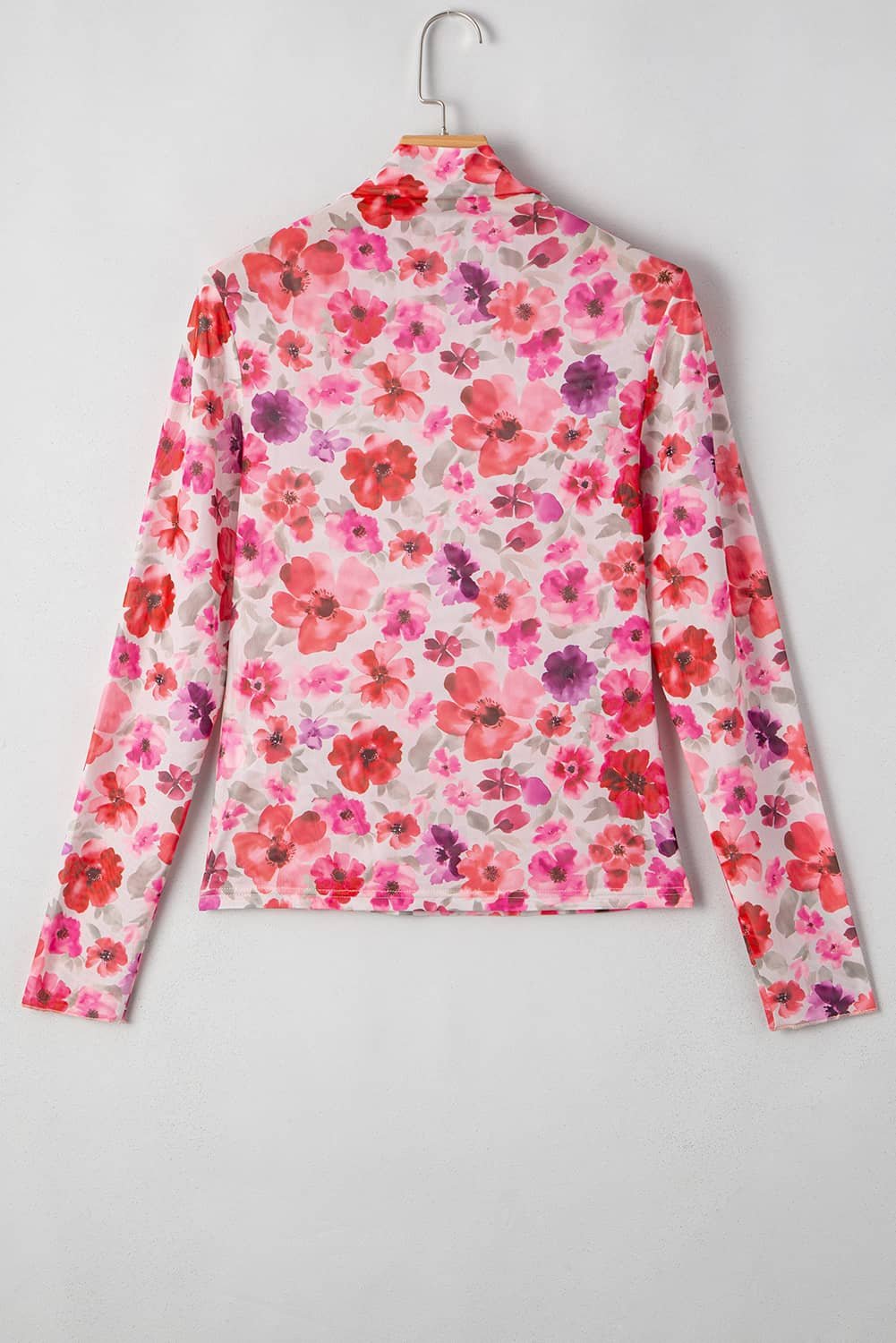 Red Floral Print Long Sleeve Slim Fit Mesh Top