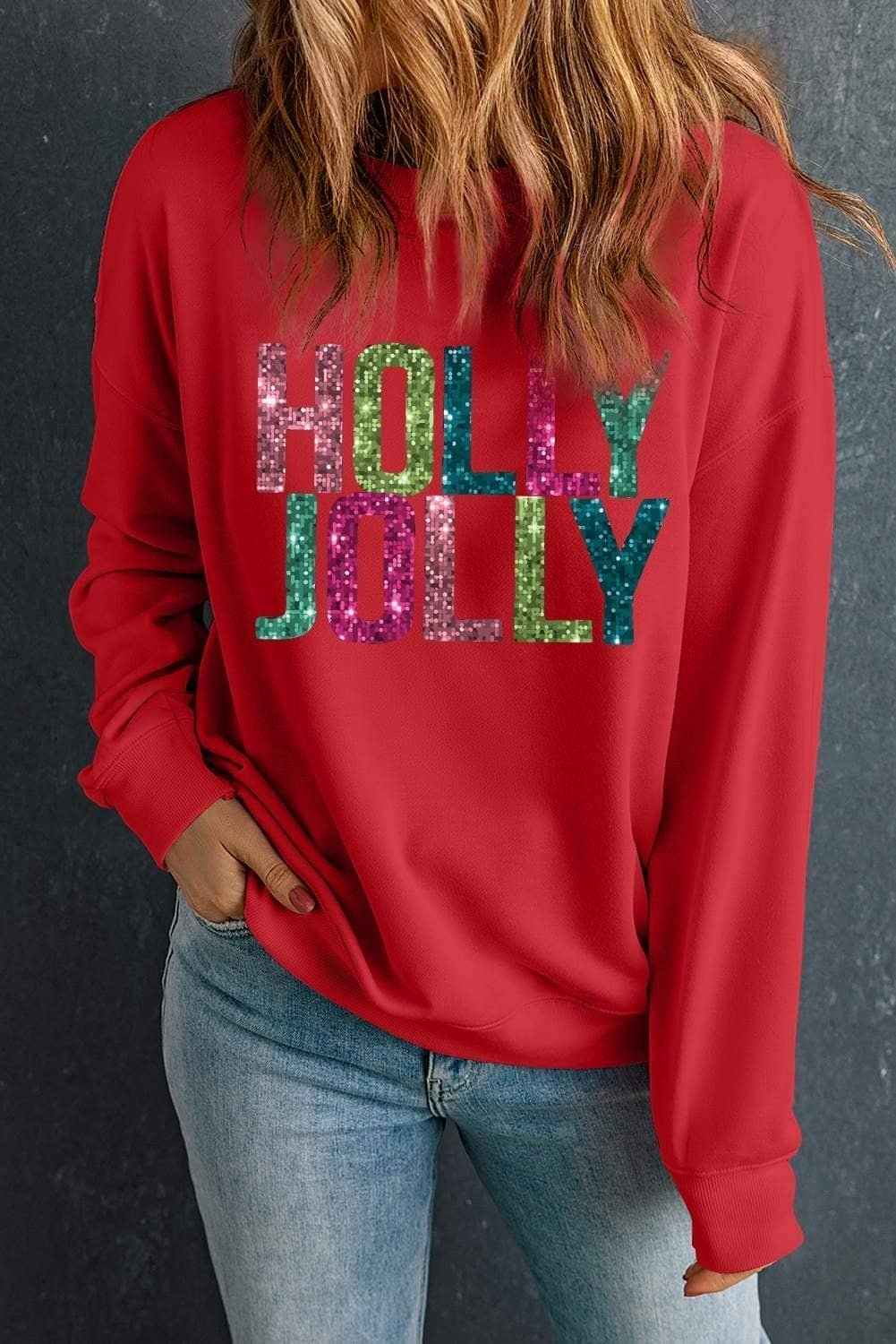 Be the first to review “Red Glittering Holly Jolly Graphic Christmas Pullover Sweatshirt”
