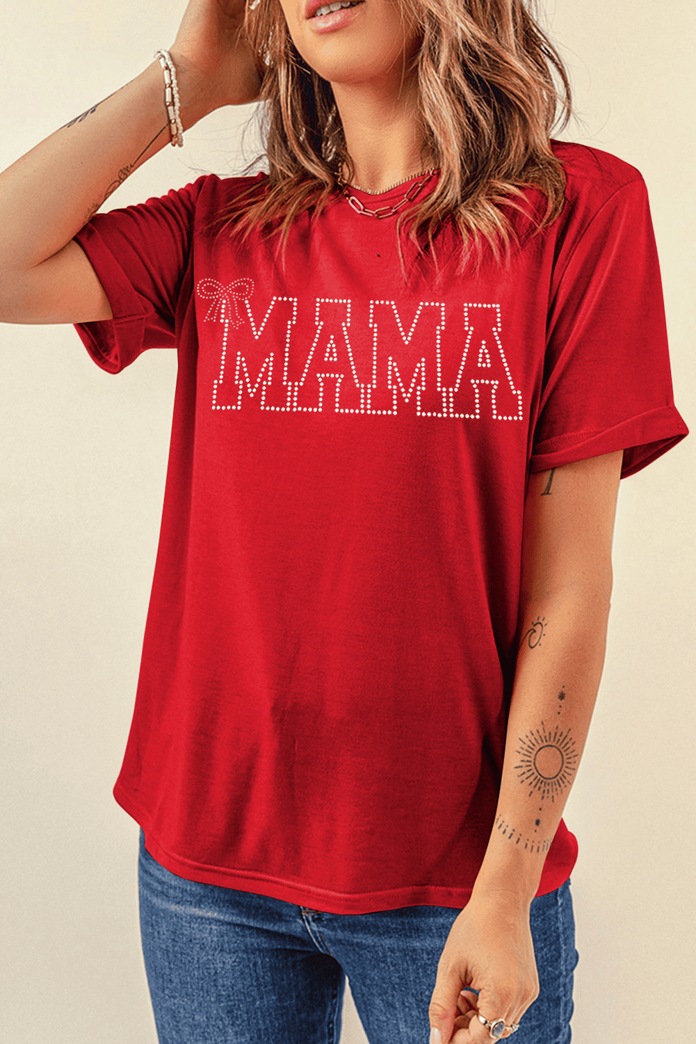 Red Rhinestone Mama Bow Knot Pattern Crew Neck Loose Tee