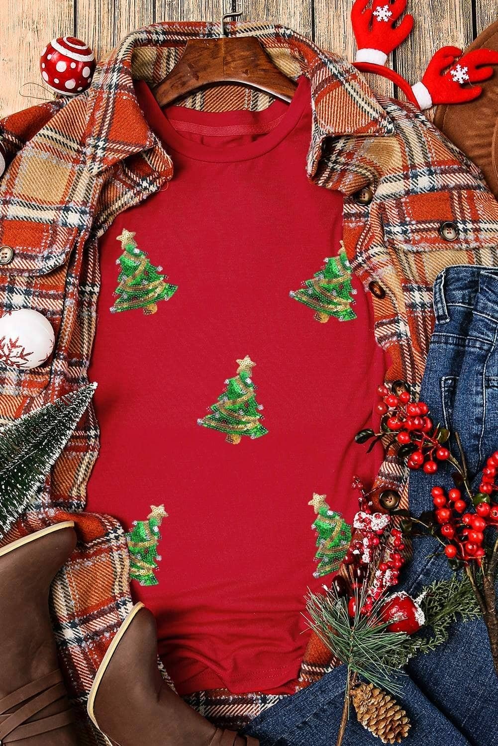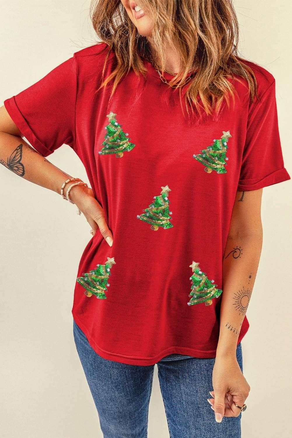 Sparkle and shine with a dazzling sequined graphic of a Christmas tree.