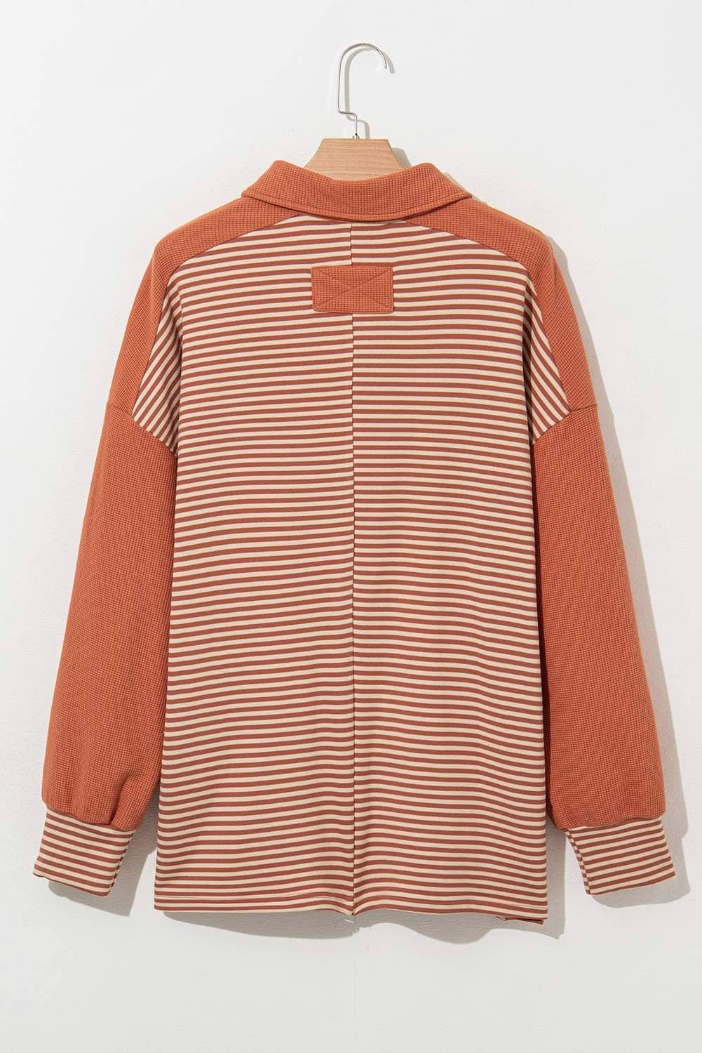 Red Stripe Textured Patched Drop Shoulder Buttoned Plus Size Sweatshirt