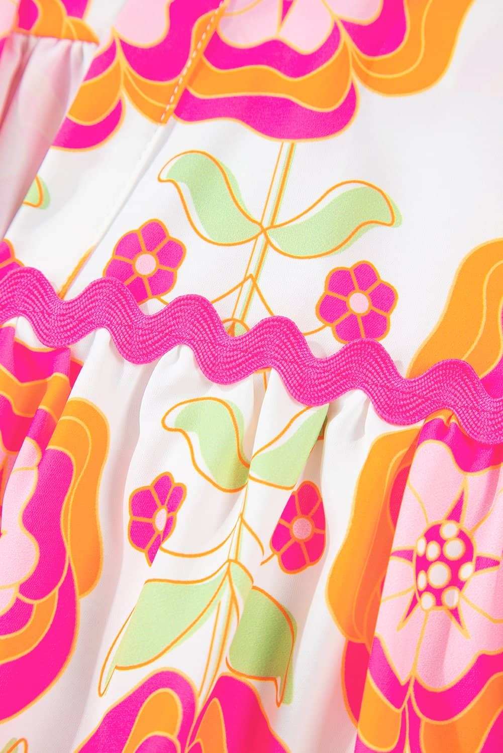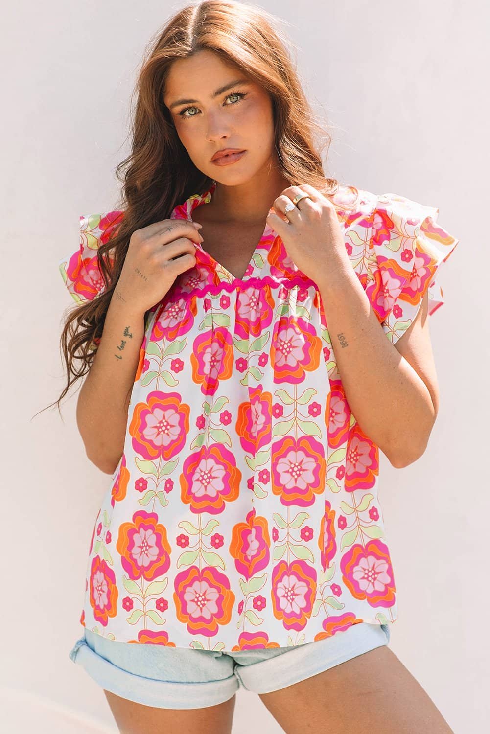 Rose Floral Ruffled Sleeve Ric-Rac Trim Split Neck Loose Blouse