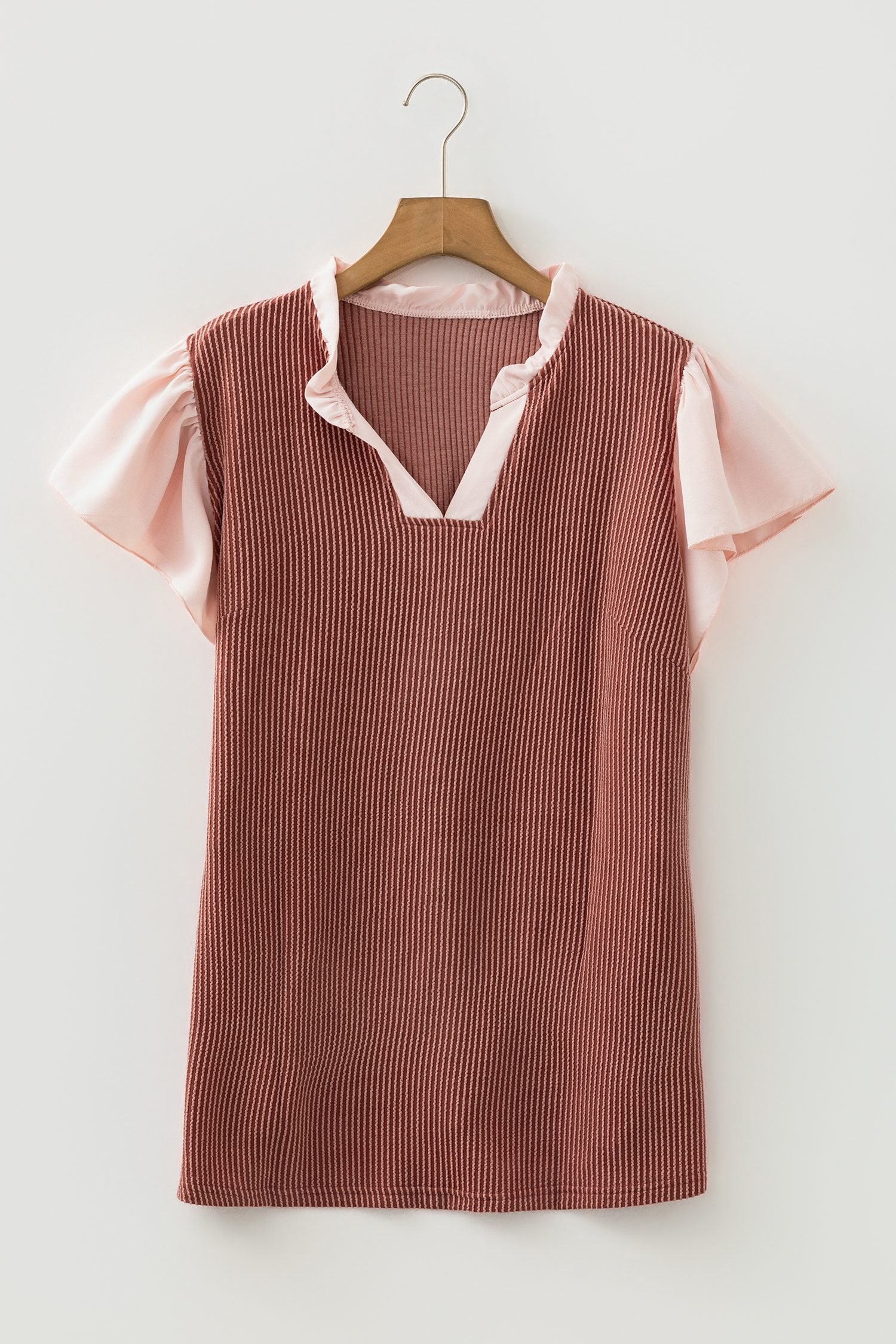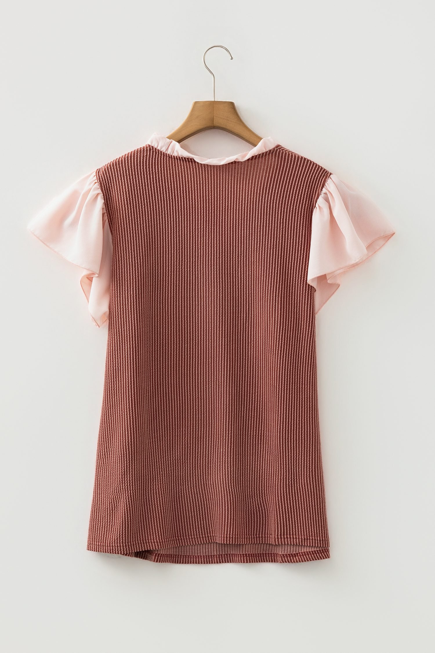 Ruffled short sleeves offer graceful arm coverage while keeping the look airy and chic.