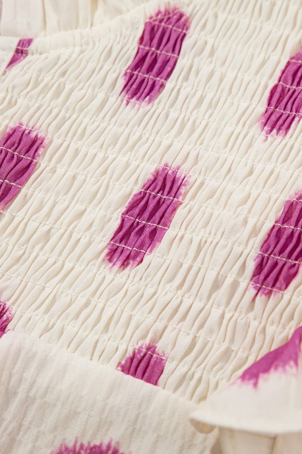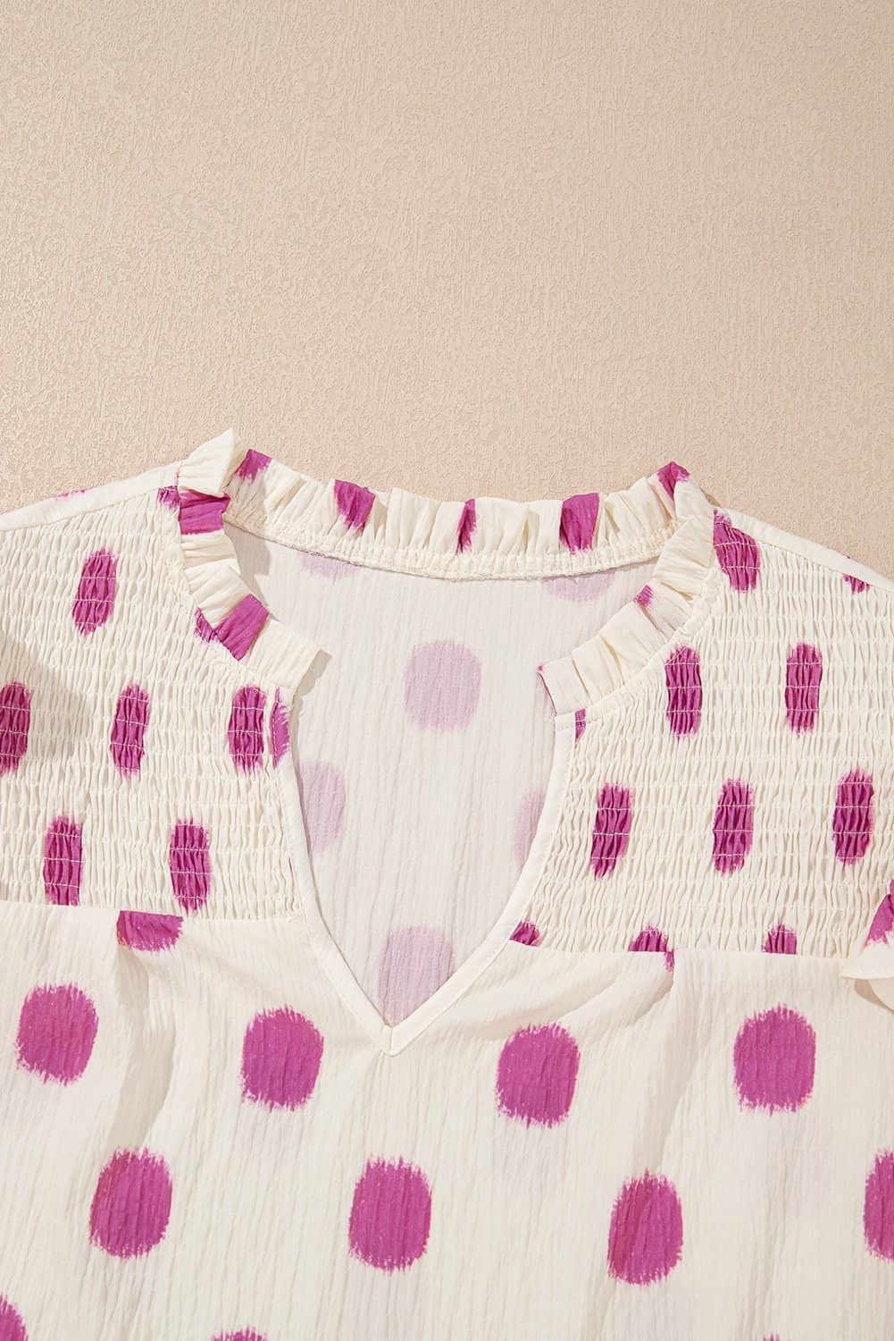 Rose Polka Dot Print Shirred Yoke Notched Neck Balloon Sleeve Blouse