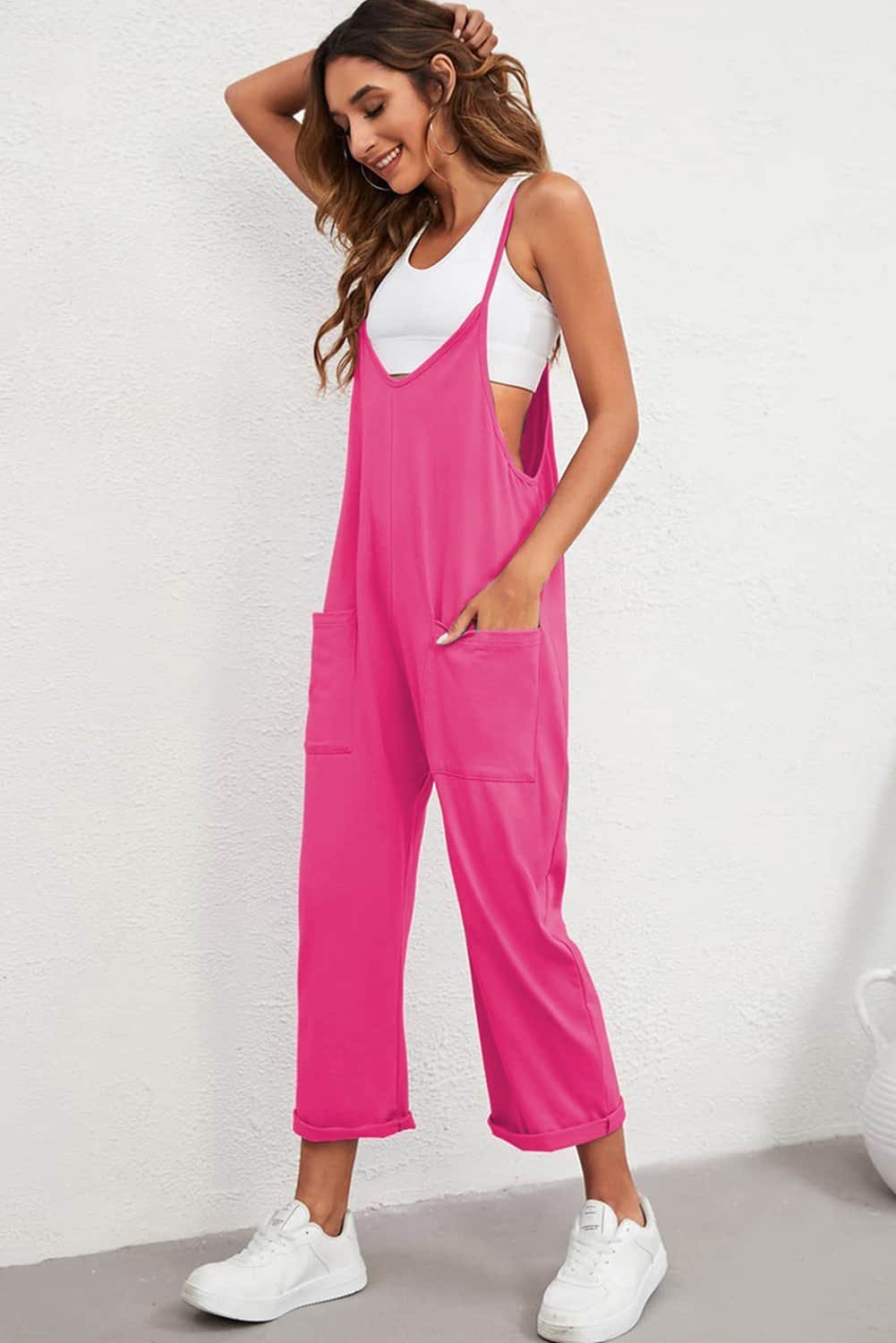 Rose Red Black Pocketed Adjustable Spaghetti Strap Straight Leg Jumpsuit