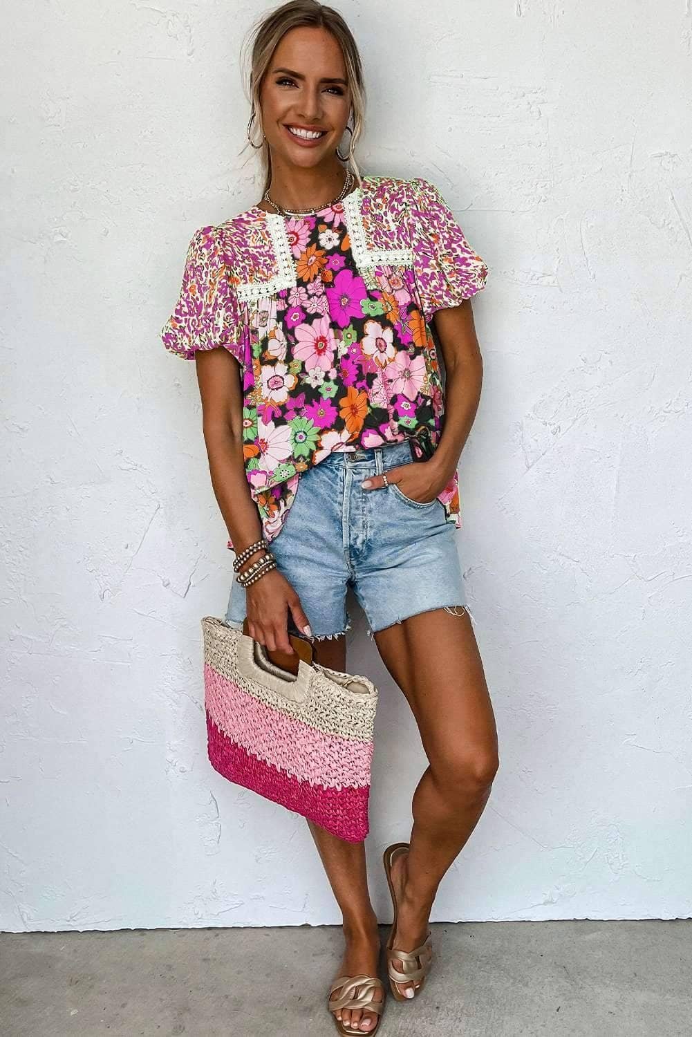 Rose Red Bubble Sleeve Lace Trim Floral Mixed Print Blouse